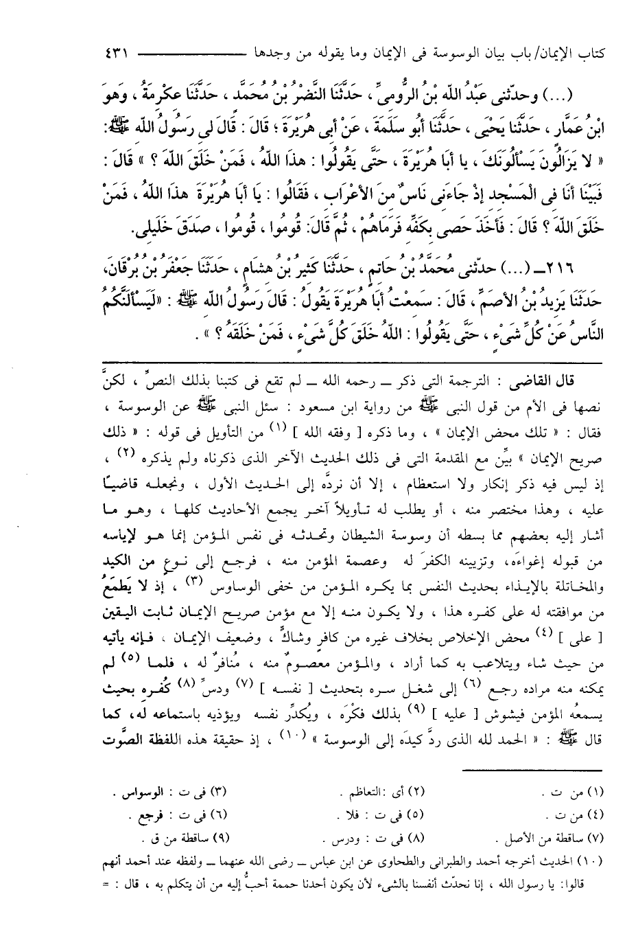 (...) وحدّثنى عَبْدُ اللهِ بْنُ الرُّومِىِّ، حَدَّثَنَا النَّضْرُ بْنُ مُحَمَّدٍ، حَدَّثَنَا عِكْرِمَةُ، وَهوَ ابْنُ عَمَّارٍ، حَدَّثَنَا يَحْيَى، حَدَّثَنَا أَبُو سَلَمَةَ، عَنْ أَبِى هُرَيْرَةَ؛ قَالَ: قَالَ لىِ رَسُولُ اللهِ صَلَّى اللهُ عَلَيْهِ وَسَلَّمَ: " لا يَزَالُونَ يَسْألُوَنَكَ، يا أَبَا هُرَيْرَةَ، حَتَّى يَقُولُوا: هذَا اللهُ، فَمَنْ خَلَقَ اللهَ؟ " قَالَ: فَبَيْنَا أَنَا فِى الْمَسْجدِ إذْ جَاءَنِى نَاسٌ مِنَ الأعْرَابِ، فَقَالُوا: يَا أَبَا هُرَيْرَةَ هذَا اللهُ، فَمَنْ خَلَقَ اللهَ؟ قَالَ: فَأخَذَ حَصى بِكَفِّهِ فَرَمَاهُمْ، ثُمَّ قَالَ: قُومُوا، قُومُوا، صَدَقَ خَلَيلِى.