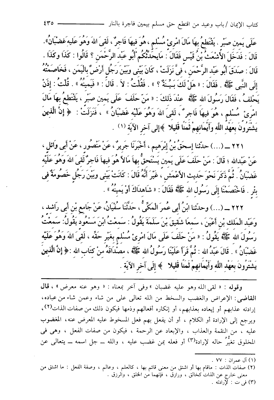 عَلَى يَمِينِ صَبْرٍ، يَقْتَطِعُ بِهَا مَالَ امْرِئٍ مُسْلِمٍ، هُوَ فِيهَا فَاجِرٌ، لَقِىَ اللهَ وَهُوَ عَليهِ غَضْبَانُ ". قَالَ: فَدَخَلَ الأَشْعَثُ بْنُ قَيْسٍ فَقَالَ: مَا يحَدِّثُكُمْ أَبُو عَبْدِ الرَّحْمَنِ؟ قَالُوا: كَذَا وكَذَا. قَالَ: صَدَقَ أَبُو عَبْدِ الرَّحْمَنِ، فِىَّ نَزَلَتْ، كَانَ بَيْنِى وَبَيْنَ رَجُلٍ أَرْضٌ بِالْيَمَن، فَخَاصَمْتُهُ إِلَى النَّبى صَلَّى اللهُ عَلَيْهِ وَسَلَّمَ. فَقَالَ: " هَلْ لَكَ بَيِّنَةٌ؟ ". فَقُلْتُ: لَا. قَالَ: " فَيَميِنُهُ ". قُلْتُ: إِذَنْ يَحْلِفُ، فَقَالَ رَسُولَ اللهِ صَلَّى اللهُ عَلَيْهِ وَسَلَّمَ عِنْدَ ذَلِكَ: " مَن حَلَفَ عَلَى يَمِينِ صَبْرٍ، يَقْتَطِعُ بِهَا مَالَ امْرِئٍ مُسْلِمٍ، هُوَ فِيهَا فَاجِرٌ، لَقِىَ اللهَ وَهُوَ عَليهِ غَضْبَانُ "، فَنَزَلَتْ: {إِنَّ الَّذِينَ يَشْتَرونَ بِعَهْدِ اللَّهِ وَأَيمَانِهِمْ ثَمَنًا قَلِيلا} وإلى آخِرِ الآيَةِ (¬1).