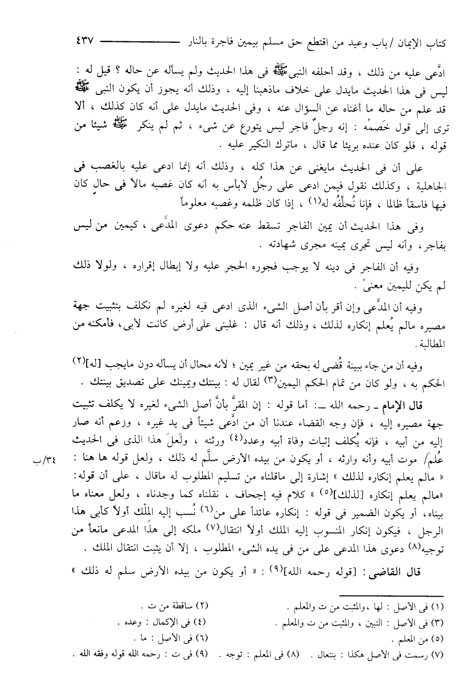 قال الإمام - رحمه الله -: أما قوله: إن المقرَّ بأنَّ أصل الشىء لغيره لا يكلف تثبيت جهة مصيره إليه، فإن وجه القضاء عندنا أن من ادَّعى شيئاً فى يد غيره، وزعم أنه صار إليه من أبيه، فإنه يُكلف إثبات وفاة أبيه وعدد (¬4) ورثته، ولَعلَ هذا الذى فى الحديث عُلمَ موت أبيه وأنه وارثه، أو يكون من بيده الأرض سلَّم له ذلك، ولعل قوله ها هنا: " ما لم يعلم إنكاره لذلك " إشارة إلى ما قلناه من تسليم المطلوب له ما قال، على أن قوله: " ما لم يعلم إنكاره [لذلك] (¬5) " كلام فيه إجحاف، نقلناه كما وجدناه، ولعل معناه ما بيناه، أو يكون الضمير فى قوله: إنكاره عائداً على من (¬6) نُسب إليه المِلْك أولاً كأبى هذا الرجل، فيكون إنكار المنسوب إليه الملك أولاً انتقال (¬7) ملكه إلى هذا المدعى مانعاً من توجيه (¬8) دعوى هذا المدعى على من فى يده الشىء المطلوب، إلا أن يثبت انتقال الملك.