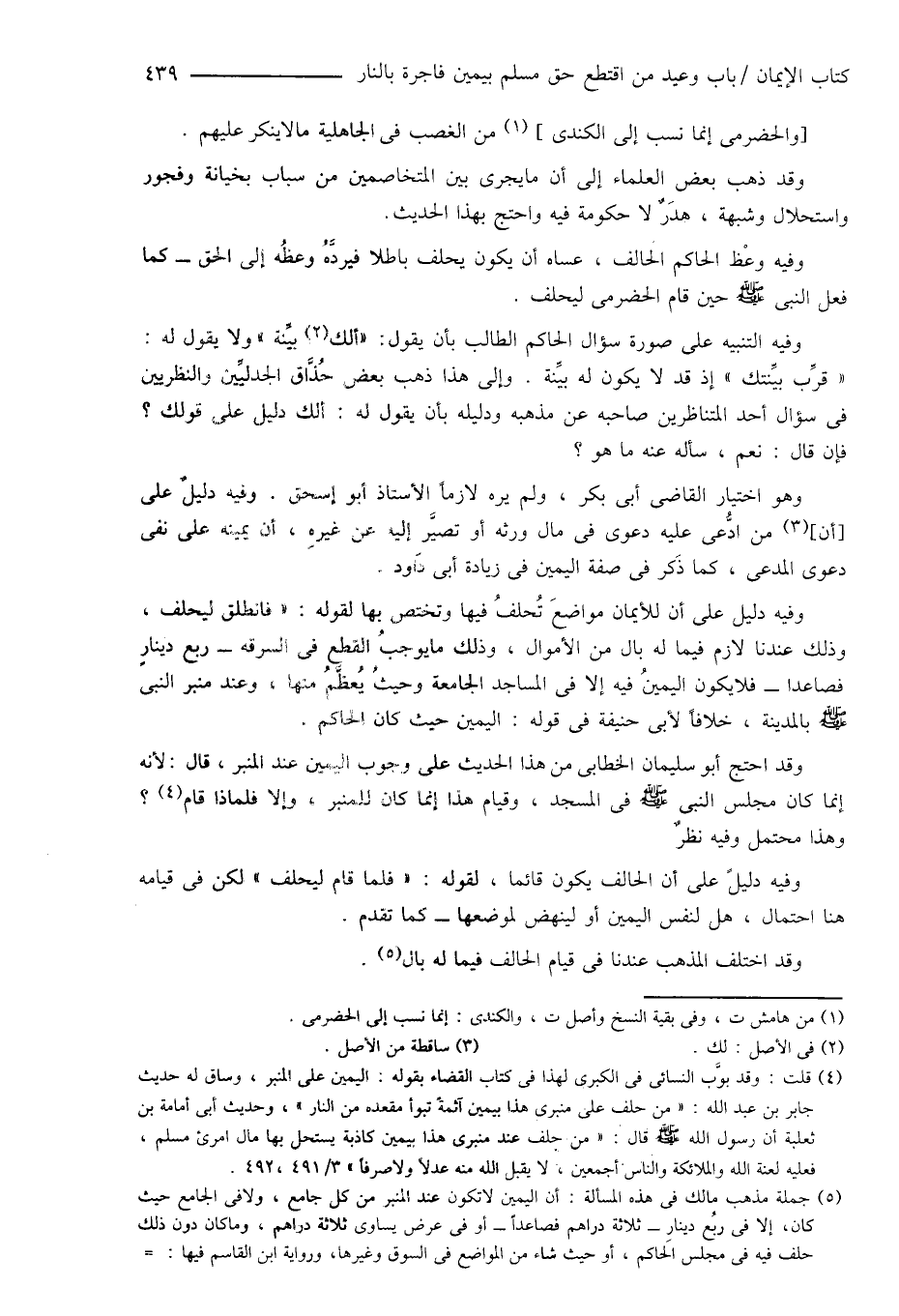 (¬4) قلت: وقد بوَّب النسائى فى الكبرى لهذا فى كتاب القضاء بقوله: اليمين على المنبر، وساق له حديث جابر بن عبد الله: " من حلف على منبرى هذا بيمين آثمةً تبوأ مقعده من النار "، وحديث أبى أمامة بن ثعلبة أن رسول الله صَلَّى اللهُ عَلَيْهِ وَسَلَّمَ قال: " من حلف عند منبرى هذا بيمين كاذبة يستحل بها مال امرئ مسلم، فعليه لعنة الله والملائكة والناس أجمعين، لا يقبل الله منه عدلاً ولا صرفاً " 3/ 491، 492.