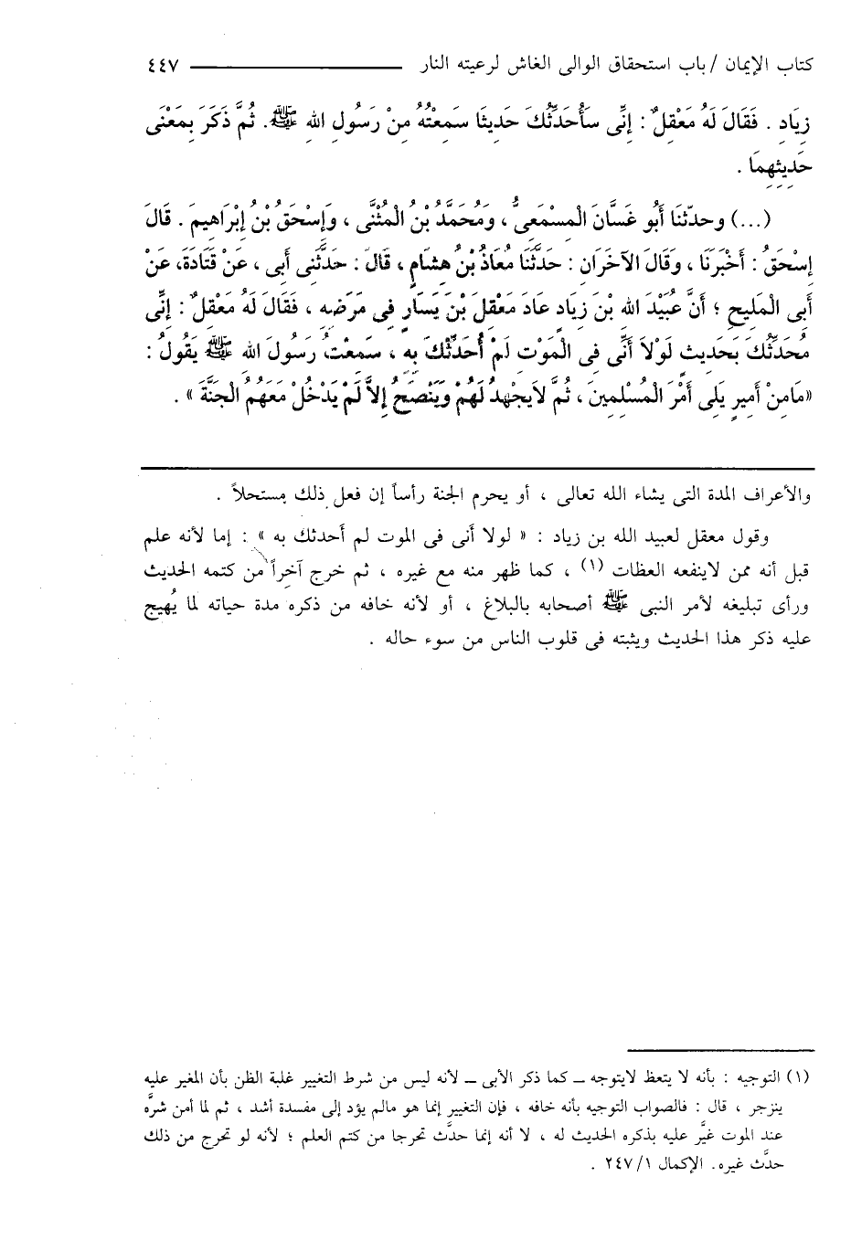 (...) وحدّثنَا أَبُو غَسَّانَ الْمِسْمَعِىُّ، وَمُحَمَّدُ بْنُ الْمُثَنَّى، وَإِسْحَاقُ بْنُ إِبْرَاهِيمَ. قَالَ إِسْحَاقُ: أَخْبَرَنَا، وَقَالَ الآخَرَانِ: حَدَّثَنَا مُعَاذُ بْنُ هِشَامٍ، قَالَ: حَدَّثَنِى أَبِى، عَنْ قَتَادَةَ، عَنْ أَبِى الْمَلِيحِ؛ أَنَّ عُبَيْدَ اللهِ بْنَ زِيَادٍ عَادَ مَعْقِلَ بْنَ يَسَارٍ فِى مَرَضِهِ، فَقَالَ لَهُ مَعْقِلٌ: إِنِّى مُحَدِّثُكَ بَحَدِيثٍ لَوْلاَ أَنِّى فِى الْمَوْتِ لَمْ أُحَدِّثْكَ بِهِ، سَمِعْتُ رَسُولَ اللهِ صَلَّى اللهُ عَلَيْهِ وَسَلَّمَ يَقُولُ: " مَا مِنْ أَمِيرٍ يَلِىَ أَمْرَ الْمُسْلِمِينَ، ثُمَّ لَا يجْهدُ لَهُمْ وَيَنْصَحُ إِلَّا لَمْ يَدْخُلْ مَعَهُمُ الْجَنَّةَ ".
