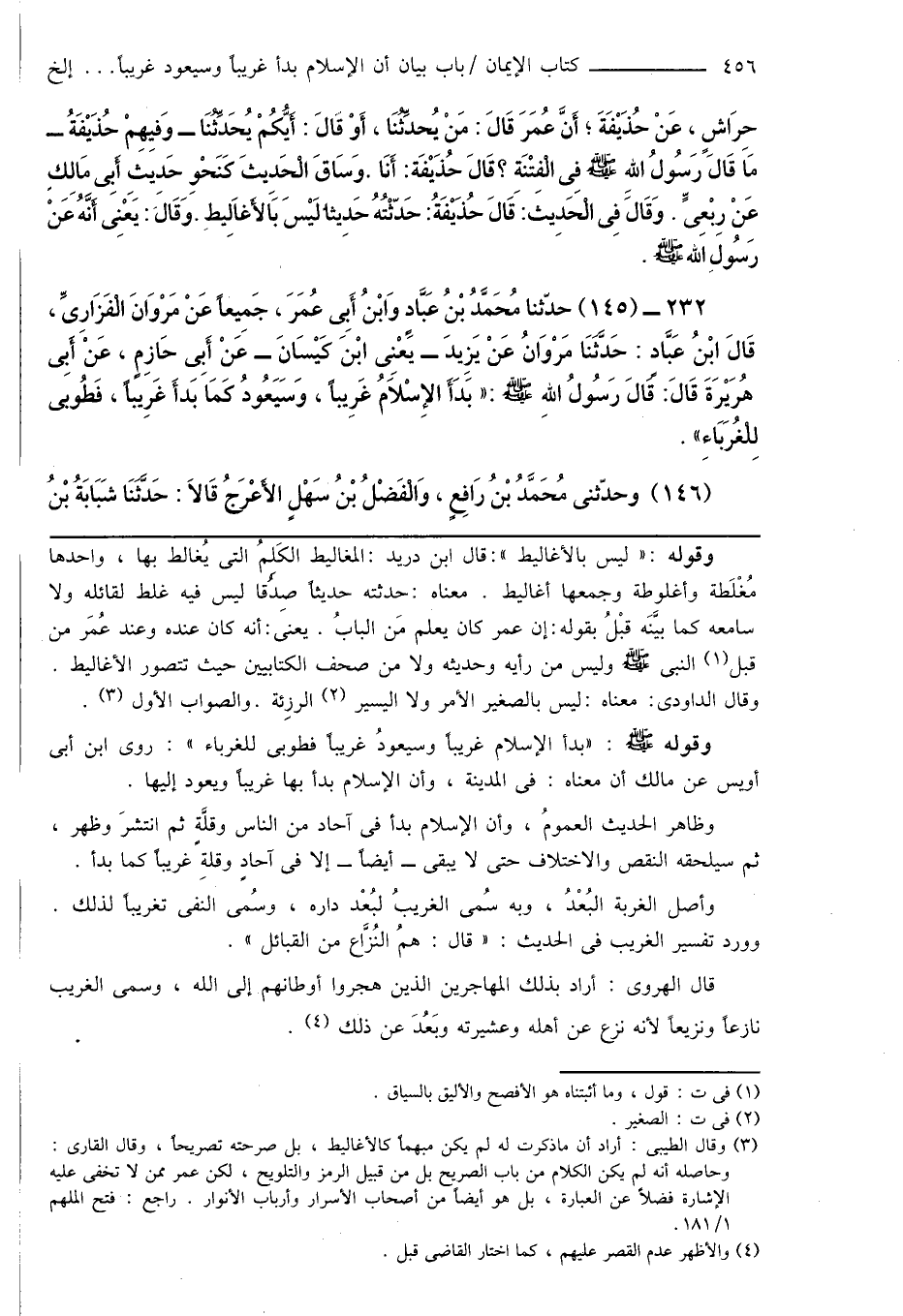 232 - (145) حدّثنا مُحَمَّدُ بْنُ عَبَّادٍ وَابْنُ أَبِى عُمَرَ، جَمِيعًا عَنْ مَرْوَانَ الْفَزَارِىِّ، قَالَ ابْنُ عَبَّادٍ: حَدَّثَنَا مَرْوَانُ عَنْ يَزِيدَ - يَعْنِى ابْنَ كَيْسَانَ - عَنْ أَبِى حَازِمٍ، عَنْ أَبِى هُرَيْرَةَ قَالَ: قَالَ رَسُولُ اللهِ صَلَّى اللهُ عَلَيْهِ وَسَلَّمَ: " بَدَأَ الإِسْلَامُ غَرِيباً، وَسَيَعُودُ كَمَا بَدأَ غَرِيباً، فَطُوبى لِلْغُرَبَاءِ ".