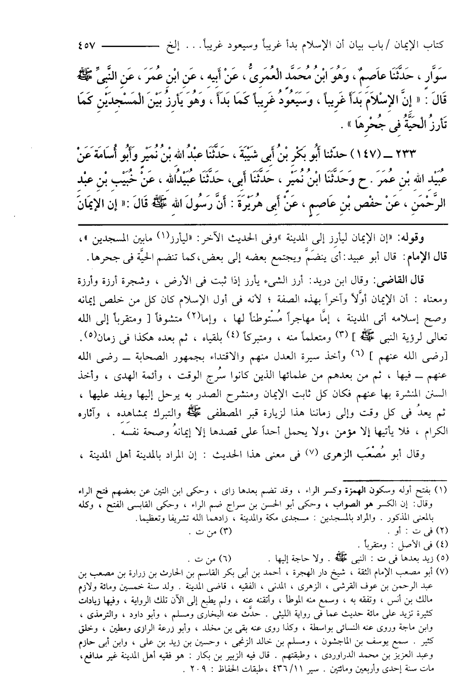 سَوَّارٍ، حَدَّثَنَا عَاصِمٌ، وَهُوَ ابْنُ مُحَمَّدٍ الْعُمَرِىُّ، عَنْ أَبِيهِ، عَنِ ابْنِ عُمَرَ، عَنِ النَّبِىِّ صَلَّى اللهُ عَلَيْهِ وَسَلَّمَ قَالَ: " إِنَّ الإِسْلَامَ بَدَأَ غَرِيباً، وَسَيَعُودُ غَرِيباً كَمَا بَدَأَ، وَهُوَ يَأرِزُ بَيْنَ الْمَسْجِدَيْنِ كَمَا تَأرزُ الْحَيَّةُ فِى جُحْرِهَا ".