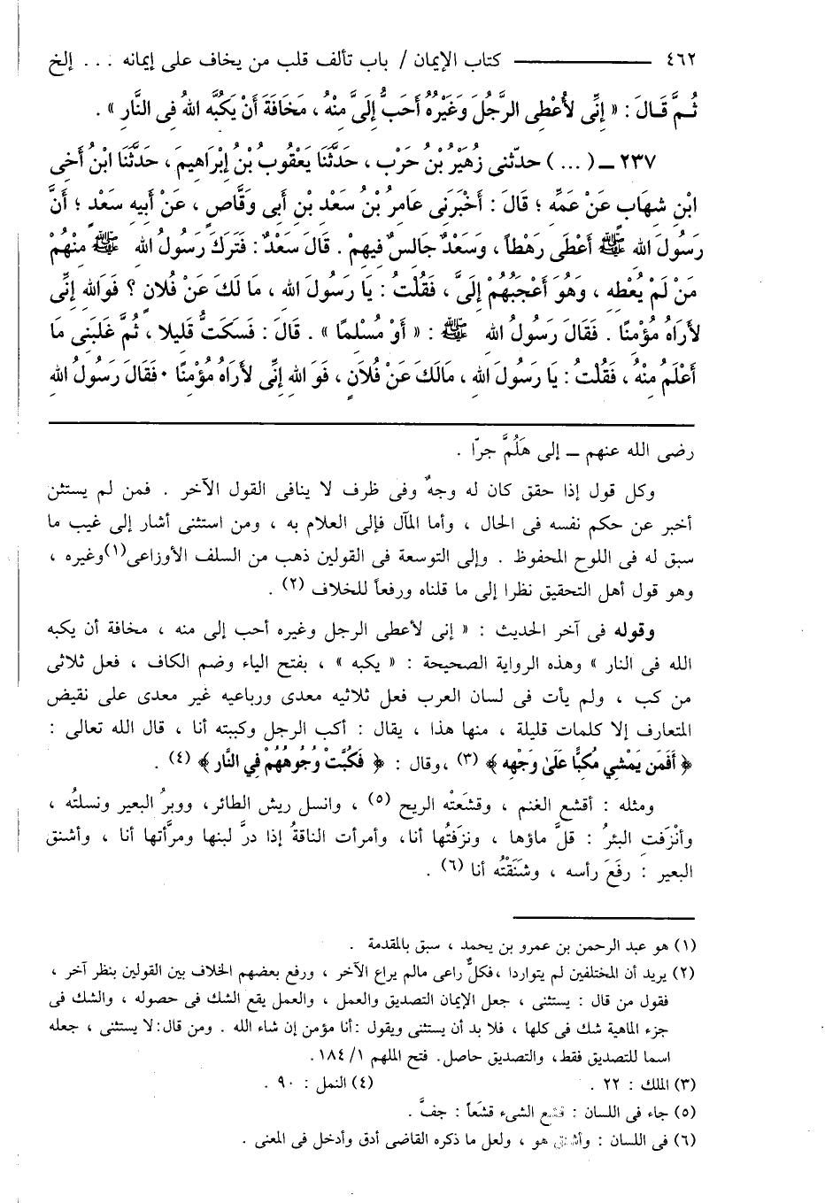 وقوله فى آخر الحديث: " إنى لأعطى الرجل وغيره أحب إلى منه، مخافة أن يكبه الله فى النار " وهذه الرواية الصحيحة: " يكبه "، بفتح الياء وضم الكاف، فعل ثلاثى من كب، ولم يأت فى لسان العرب فعل ثلاثيه معدى ورباعيه غير معدى على نقيض المتعارف إلا كلمات قليلة، منها هذا، يقال: أكب الرجل وكببته أنا، قال الله تعالى: {أَفَمَن يَمْشِي مُكِبًّا عَلَى وَجْهِه} (¬3)، وقال: {فَكُبَّتْ وُجُوهُهُمْ فِي النَّار} (¬4).