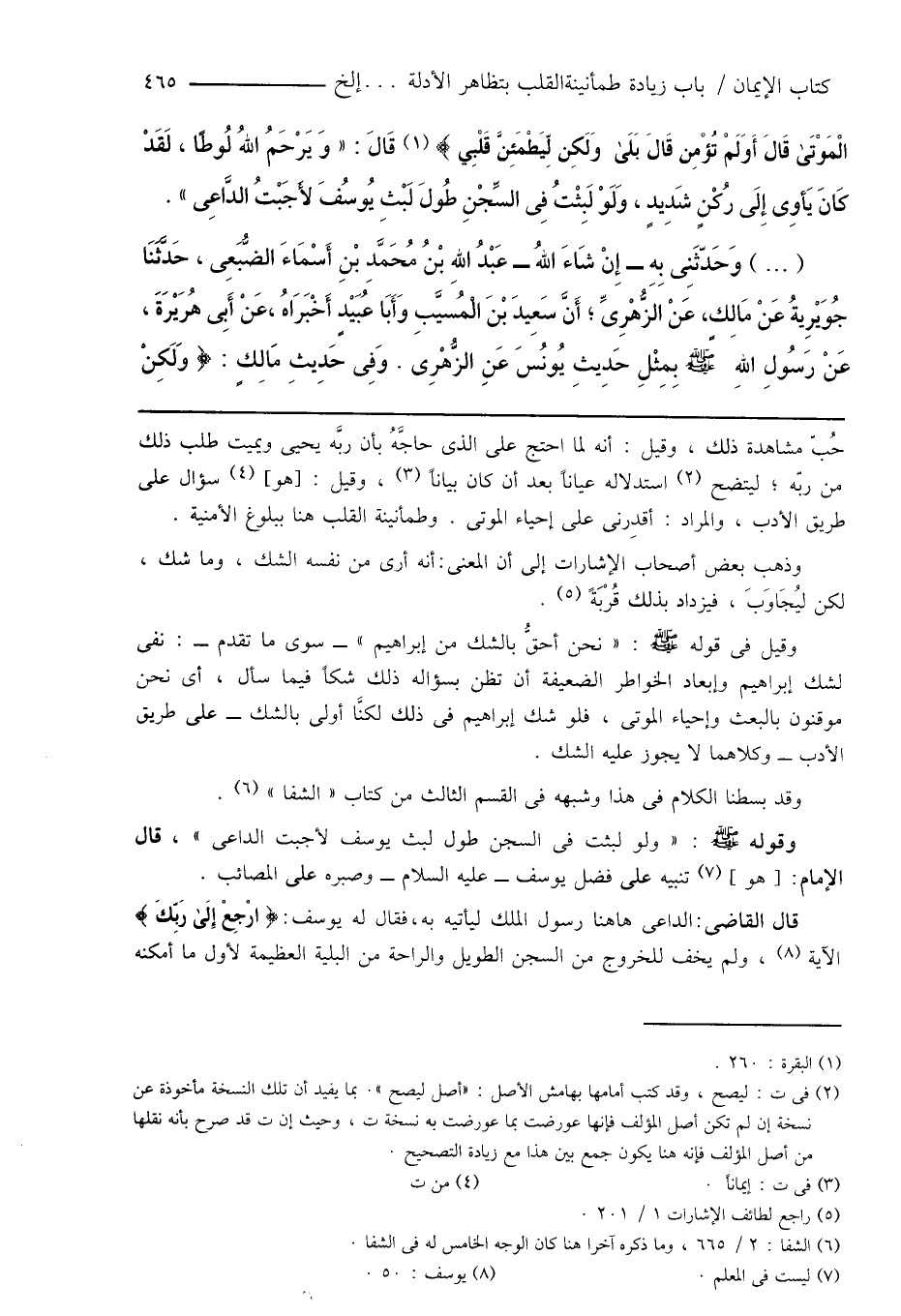 وقيل فى قوله صَلَّى اللهُ عَلَيْهِ وَسَلَّمَ: " نحن أحقُّ بالشك من إبراهيم " - سوى ما تقدم -: نفى لشك إبراهيم وإبعاد الخواطر الضعيفة أن تظن بسؤاله ذلك شكاً فيما سأل، أى نحن موقنون بالبعث وإحياء الموتى، فلو شك إبراهيم فى ذلك لكنَّا أولى بالشك - على طريق الأدب - وكلاهما لا يجوز عليه الشك.