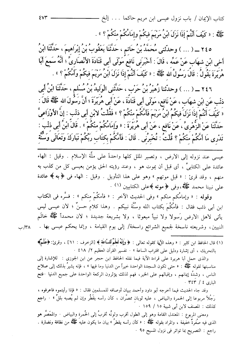 245 - (...) وحدّثنى مُحَمَّدُ بْنُ حَاتِمٍ، حَدَّثَنَا يَعْقُوبُ بْنُ إِبْرَاهِيمَ، حَدَّثَنَا ابْنُ أَخِى ابْنِ شِهَابٍ عَنْ عَمِّهِ، قَالَ: أَخْبَرَنِى نَافِعٌ مَوْلَى أَبِى قَتَادَةَ الأَنْصَارِىِّ؛ أَنَّهُ سَمِعَ أَبَا هُرَيْرَةَ يَقُولُ: قَالَ رَسُولُ اللهِ صَلَّى اللهُ عَلَيْهِ وَسَلَّمَ: " كَيْفَ أَنْتُمْ إِذَا نَزَلَ ابْنُ مَرْيَمَ فِيكُمْ وَأَمَّكُمْ؟ ".