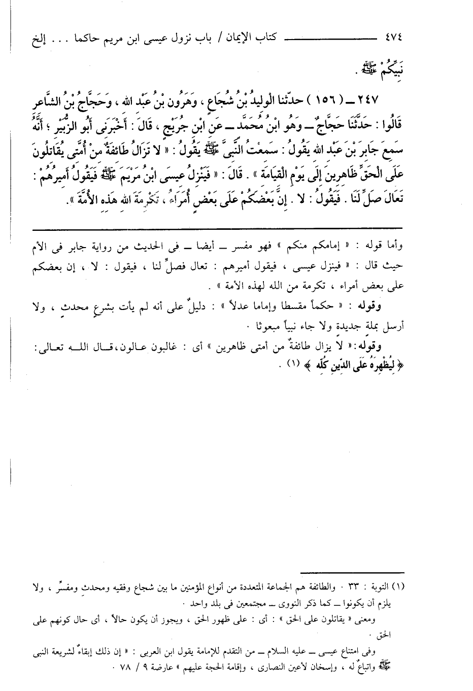 (¬1) التوبة: 33. والطائفة هم الجماعة المتعددة من أنواع المؤمنين ما بين شجاع وفقيه ومحدثٍ ومفسِّر، ولا يلزم أن يكونوا - كما ذكر النووى - مجتمعين فى بلد واحد.