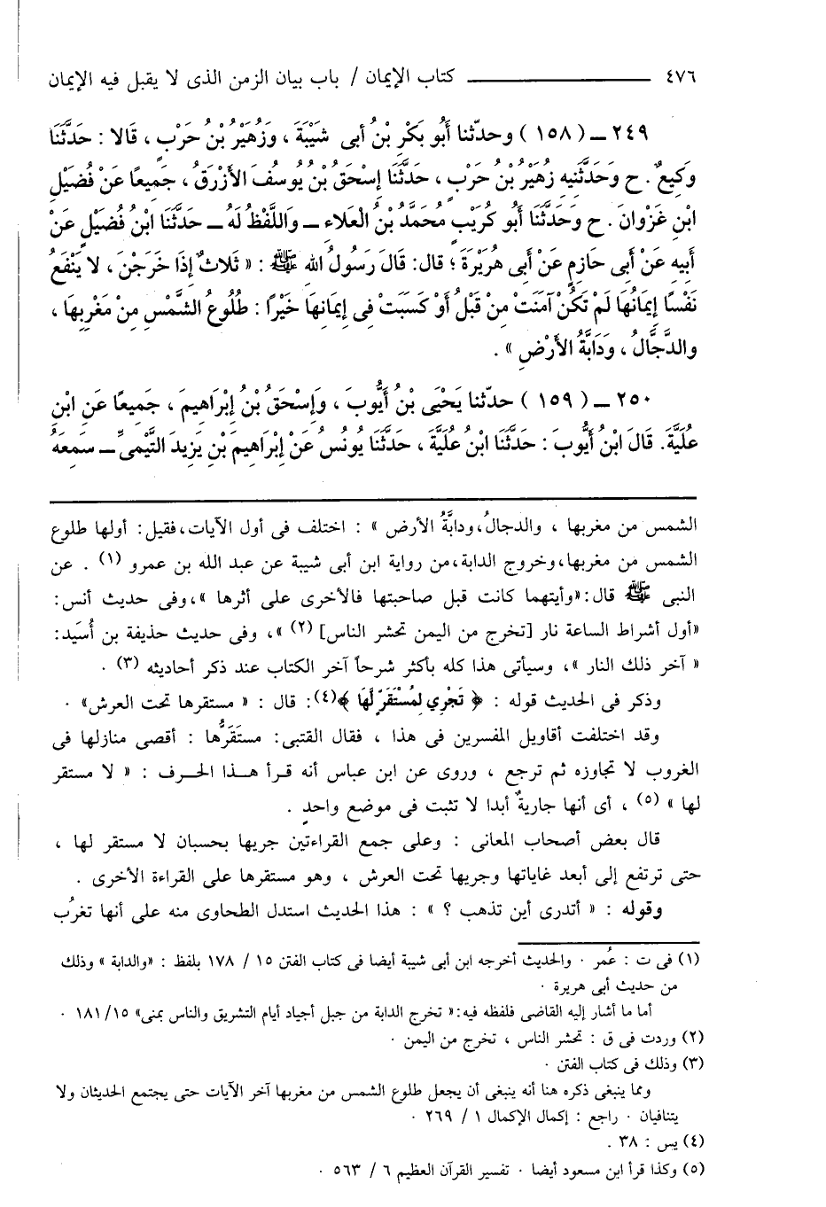 249 - (158) وحدّثنا أَبُو بَكْرِ بْنُ أبى شَيْبَةَ، وَزهُيْرُ بْنُ حَرْبٍ، قَالا: حَدَّثَنَا وَكِيعٌ. ح وَحَدَّثَنِيهِ زُهَيْرُ بْنُ حَرْبٍ، حَدَّثَنَا إِسْحَاقُ بْنُ يُوسُفَ الأَزْرَقُ، جَمِيعًا عَنْ فُضَيْلِ ابْنِ غَزْوانَ. ح وَحَدَّثَنَا أَبُو كُرَيْبٍ مُحَمَّدُ بْنُ الْعَلاءِ - وَاللَّفْظُ لَهُ - حَدَّثَنَا ابْنُ فُضَيْلٍ عَنْ أَبِيهِ عَنْ أَبِى حَازِمٍ عَنْ أَبِى هُرَيْرَةَ؛ قال: قَالَ رَسُولُ اللهِ صَلَّى اللهُ عَلَيْهِ وَسَلَّمَ: " ثَلاثٌ إِذَا خَرَجْنَ، لا يَنْفَعُ نَفْسًا إيمَانُهَا لَمْ تَكُنْ آمَنَتْ مِنْ قَبْلُ أَوْ كَسَبَتْ فِى إِيمَانِهَا خَيْرًا: طُلُوعُ الشَّمْسِ مِنْ مَغْرِبِهَا، والدَّجَّالُ، وَدَابَّةُ الأَرْضِ ".