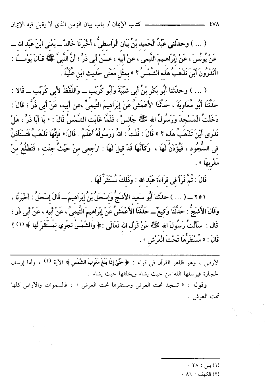 251 - (...) حدّثنا أَبُو سَعِيدٍ الأَشَجُّ وَإِسْحَاقُ بْنُ إِبْرَاهِيمَ - قَالَ إِسْحَاقُ: أَخْبَرَنَا، وَقَالَ الأَشَجُّ: حَدَّثَنَا وَكِيعٌ - حَدَّثَنَا الأَعْمَشُ عَنْ إِبْرَاهِيمَ التَّيمِىِّ، عَنْ أَبِيهِ، عَنْ أَبِى ذَرٍّ؛ قَال: سَأَلْتُ رَسُولَ اللهِ صَلَّى اللهُ عَلَيْهِ وَسَلَّمَ عَنْ قَوْلِ اللهِ تَعَالَى: {وَالشَّمْسُ تَجْرِي لِمُسْتَقَرٍّ لَّهَا} (¬1)؟ قَالَ: " مُسْتَقَرُّهَا تَحْتَ الْعَرْشِ ".