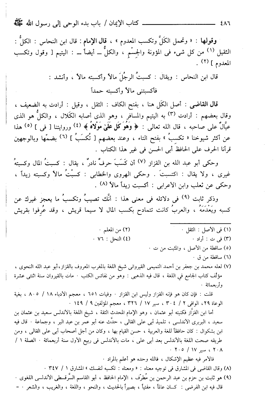 قال القاضى: أصل الكَل هنا، بفتح الكاف: الثقل، وقيل: أرادت به الضعيف، وقال بعضهم: أرادت (¬3) به اليتيم والمسافر، وهو الذى أصابه الكَلال، والكلُّ هو الذى عيَّالٌ على صاحبه، قال الله تعالى: {وَهُوَ كَل عَلَى مَوْلاهُ} (¬4) وروايتنا [فى] (¬5) هذا عن أكثر شيوخنا " تكسِبُ " بفتح التاء، وعند بعضهم [تُكسَبُ] (¬6) بضمّها وبالوجهين قرأنا الحرف على الحافظ أبى الحسن فى غير هذا الكتاب.