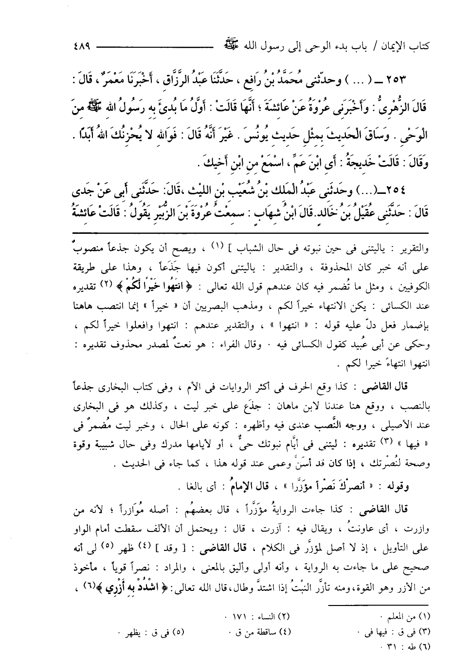 253 - (...) وحدّثنى مُحَمَّدُ بْنُ رَافِع، حَدَّثَنَا عَبْدُ الرَّزَّاقِ، أَخْبَرَنَا مَعْمَرٌ، قَالَ: قَالَ الزُّهْرِىُّ: وَأَخْبَرَنِى عُرْوَةُ عَنْ عَائِشَةَ؛ أَنَّهَا قَالَتْ: أَوَّلُ مَا بُدِئَ بِهِ رَسُولُ اللهِ صَلَّى اللهُ عَلَيْهِ وَسَلَّمَ مِنَ الْوَحْىِ. وَسَاقَ الْحَدِيثَ بِمِثْلِ حَدِيثِ يُونُسَ. غَيْرَ أَنَّهُ قَالَ: فَوَاللهِ لا يُحْزِنُكَ اللهُ أَبَدًا. وَقَالَ: قَالَتْ خَدِيجَةُ: أَىِ ابْنَ عَمِّ، اسْمَعْ مِنِ ابْنِ أَخِيكَ.