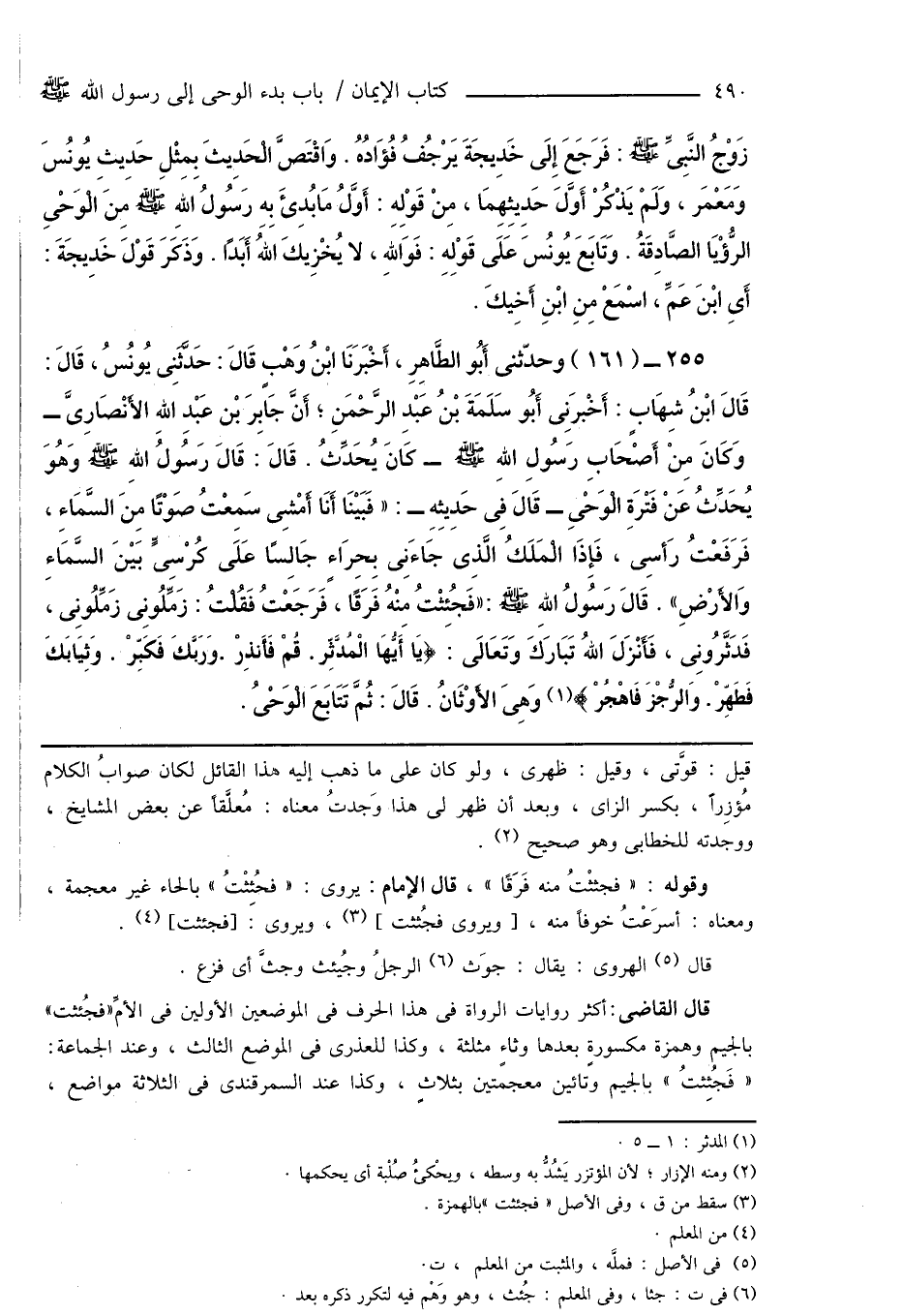 255 - (161) وحدّثنى أَبُو الطَّاهِرِ، أَخْبَرَنَا ابْنُ وَهْبٍ قَالَ: حَدَّثَنِى يُونُسُ، قَالَ: قَالَ ابْنُ شِهَابٍ: أَخْبرَنِى أَبُو سَلَمَةَ بْنُ عَبْدِ الرَّحْمَنِ؛ أَنَّ جَابِرَ بْن عَبْدِ اللهِ الأَنْصَارِىَّ - وَكَانَ مِنْ أَصْحَابِ رَسُولِ اللهِ صَلَّى اللهُ عَلَيْهِ وَسَلَّمَ - كَانَ يُحَدِّثُ. قَالَ: قَالَ رَسُولُ اللهِ صَلَّى اللهُ عَلَيْهِ وَسَلَّمَ وَهُوَ يُحَدِّثُ عَنْ فَتْرَةِ الْوَحْىِ - قَالَ فِى حَدِيثِهِ -: " فَبَيْنَا أَنَا أَمْشِى سَمِعْتُ صَوْتًا مِنَ السَّمَاءِ، فَرَفَعْتُ رَأسِى، فَإِذَا الْمَلَكُ الَّذِى جَاءَنِى بِحِرَاءٍ جَالِسًا عَلَى كُرْسِىٍّ بَيْنَ السَّمَاءِ وَالأَرْضِ ". قَالَ رَسُولُ اللهِ صَلَّى اللهُ عَلَيْهِ وَسَلَّمَ: " فَجُئِثْتُ مِنْهُ فَرَقًا، فَرَجَعْتُ فَقُلْتُ: زَمِّلُونِى زَمِّلُونِى، فَدَثَّرُونِى، فَأَنْزَلَ اللهُ تَبَارَكَ وَتَعَالَى: {يَا أَيُّهَا الْمُدَّثِّر. قُمْ فَأَنذِرْ. وَرَبَّكَ فَكَبِّرْ. وَثِيَابَكَ فَطَهِّرْ. وَالرُّجْزَ فَاهْجُرْ} (¬1) وَهِىَ الأَوْثَانُ. قَالَ: ثُمَّ تَتَابَعَ الْوَحْىُ.