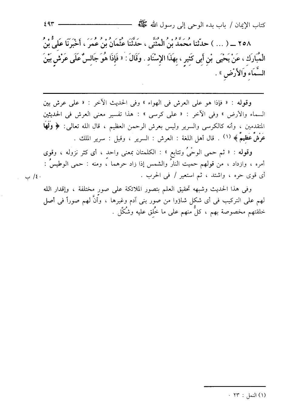 258 - (...) حدّثنا مُحَمَّدُ بْنُ الْمُثَنَّى، حَدَّثَنَا عُثْمَانُ بْنُ عُمَرَ، أَخْبَرَنَا عَلِىُّ بْنُ الْمُبَارَكِ، عَنْ يَحْيَى بْنِ أَبِى كَثِيرٍ، بِهَذَا الإِسْنَادِ. وَقَالَ: " فَإِذَا هُوَ جَالِسٌ عَلَى عَرْشِ بَيْنَ السَّمَاءِ وَالأَرْضِ ".
