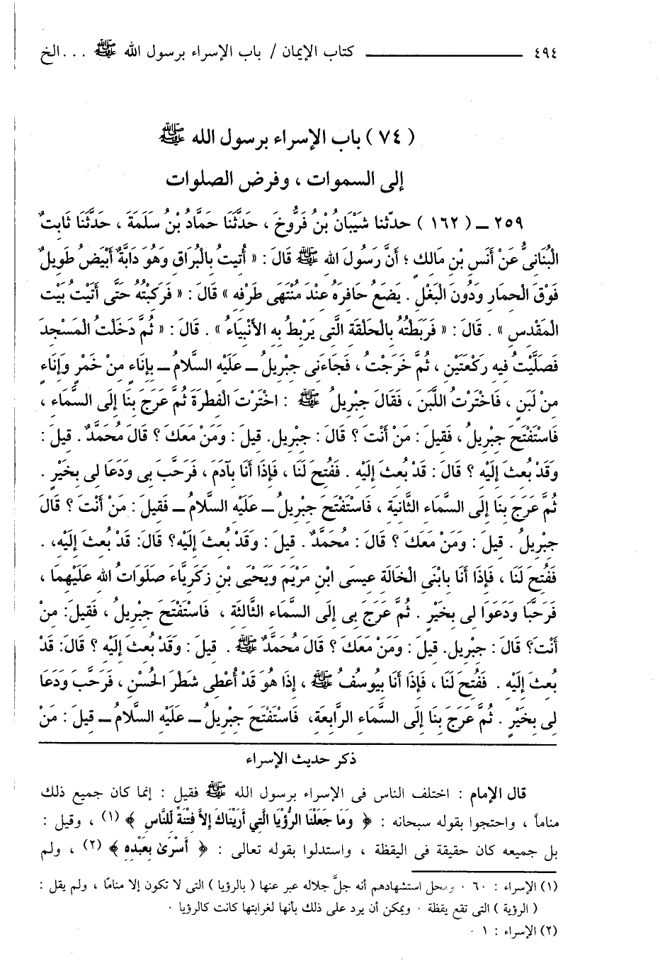 (74) باب الإسراء برسول الله صَلَّى اللهُ عَلَيْهِ وَسَلَّمَ إلى السماوات، وفرض الصلوات
