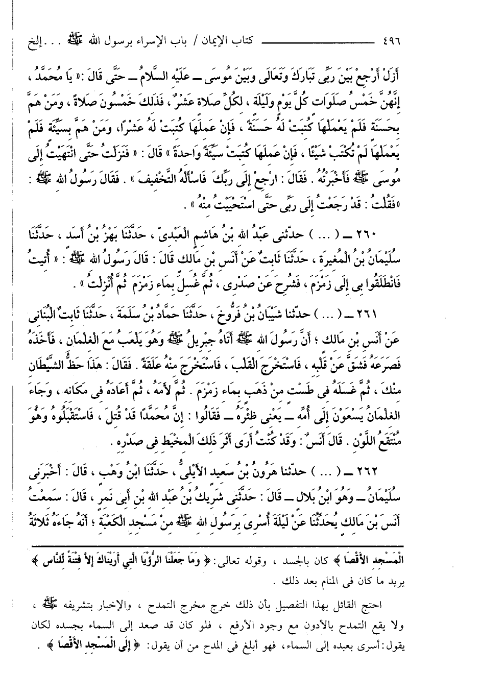 260 - (...) حدّثنى عَبْدُ اللهِ بْنُ هَاشِمٍ الْعَبْدِىّ، حَدَّثَنَا بَهْزُ بْنُ أَسَدٍ، حَدَّثَنَا سُلَيْمَانُ بْنُ الْمُغِيرَةِ، حَدَّثَنَا ثَابِتٌ عَنْ أَنَسِ بْنِ مَالِكٍ قَالَ: قَالَ رَسُولُ اللهِ صَلَّى اللهُ عَلَيْهِ وَسَلَّمَ: " أُتِيتُ فَانْطَلَقُوا بِى إِلَى زَمْزَمَ، فَشُرِحَ عَنْ صَدْرِى، ثُمَّ غُسِلَ بِمَاءِ زَمْزَمَ ثُمَّ أُنزِلْتُ ".