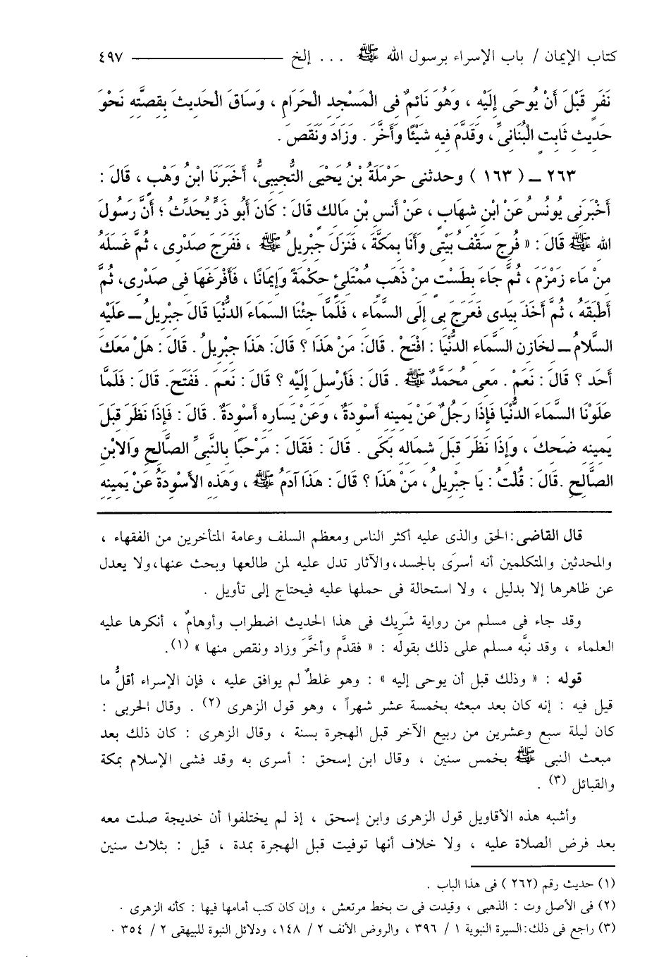 263 - (163) وحدثنى حَرْمَلَةُ بْنُ يَحْيَى التُّجِيبِىُّ، أَخبَرَنَا ابْنُ وَهْبٍ، قَالَ: أَخْبَرَنِى يُونُسُ عَنْ ابْنِ شِهَابٍ، عَنْ أَنسِ بْنِ مَالِكٍ قَالَ: كَانَ أَبُو ذَرٍّ يُحَدِّثُ؛ أَنَّ رَسُولَ اللهِ صَلَّى اللهُ عَلَيْهِ وَسَلَّمَ قَالَ: " فُرِجَ سَقْفُ بَيْتِى وَأَنَا بِمَكَّةَ، فَنَزَلَ جِبْرِيلُ صَلَّى اللهُ عَلَيْهِ وَسَلَّمَ، فَفَرَجَ صَدْرِى، ثُمَّ غَسَلَهُ منْ مَاء زَمْزَمَ، ثُمَّ جَاءَ بِطَسْتٍ مِنْ ذَهَبٍ مُمْتَلِئٍ حِكْمَةً وَإِيمَانًا، فَأَفْرَغَهَا فِى صَدْرِى، ثُمَّ أَطْبَقَهُ، ثُمَّ أَخَذَ بِيَدِى فَعَرَجَ بِى إِلَى السَّمَاء، فَلَمَّاَ جِئْنَا السَّمَاءَ الدُّنْيَا قَالَ جِبْرِيلُ - عَلَيْهِ السَّلامُ - لِخَازِنِ السَّمَاءِ الدُّنْيَا: افْتَحْ. قَالَ: مَنْ هَذَا؟ قَالَ: هَذَا جِبْرِيلُ. قَالَ: هَلْ مَعَكَ أَحَد؟ قَالَ: نَعَمْ. مَعِى مُحَمَّدٌ صَلَّى اللهُ عَلَيْهِ وَسَلَّمَ. قَالَ: فَأرْسِلَ إِلَيْهِ؟ قَالَ: نَعَم. فَفَتَحَ. قَالَ: فَلَمَّا عَلَوْنَا السَّمَاءَ الدُّنْيَا فَإِذَا رَجُلٌ عَنْ يَمِينِهِ أَسْوِدَةٌ، وَعَنْ يَسَارِهِ أَسْوِدَةٌ. قَالَ: فَإِذَا نَظَرَ قِبَلَ يَمِينِهِ ضَحِكَ، وَإِذَا نَظَرَ قِبَلَ شِمَالِهِ بَكَى. قَالَ: فَقَالَ: مَرْحَبًا بِالنَّبِىِّ الصَّالِحِ وَالابْنِ الصَّالِحِ. قَالَ: قُلْتُ: يَا جِبْرِيلُ، مَنْ هَذَا؟ قَالَ: هَذَا آدَمُ صَلَّى اللهُ عَلَيْهِ وَسَلَّمَ، وَهَذِهِ الأَسْوِدَةُ عَنْ يَمِينِهِ