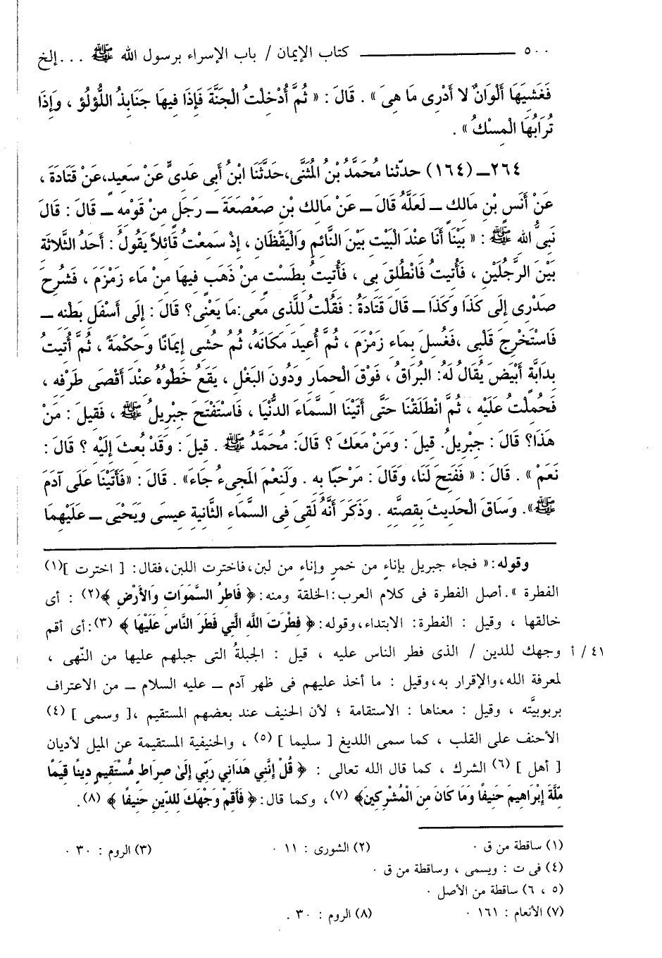 264 - (164) حدّثنا مُحَمَّدُ بْنُ المُثَنَّى، حَدَّثَنَا ابْنُ أَبِى عَدِىٍّ عَنْ سَعِيدٍ، عَنْ قَتَادَةَ، عَنْ أَنَسٍ بْنِ مَالِكٍ - لَعَلَّهُ قَالَ - عَنْ مَالِك بْنِ صَعْصَعَةَ - رَجلٍ مِنْ قَوْمِهِ - قَالَ: قَالَ نَبِىُّ اللهِ صَلَّى اللهُ عَلَيْهِ وَسَلَّمَ: " بَيْنَا أَنَا عِنْدَ الْبَيْتِ بَيْنَ النَّائِمِ وَالْيَقْظَانِ، إِذْ سَمِعْتُ قَائِلاً يَقُولُ: أَحَدُ الثَّلاثَةِ بَيْنَ الرَّجُلَيْنِ، فَأُتِيتُ فَانْطُلِقَ بِى، فَأُتِيتُ بِطَسْتٍ مِنْ ذَهَبٍ فِيهَا مِنْ مَاء زَمْزَمَ، فَشُرِحَ صَدْرِى إِلَى كَذَا وَكَذَا - قَالَ قَتَادَةُ: فَقُلْتُ لِلَّذِى مَعِى: مَا يَعْنِى؟ قَالَ: إِلَى أَسْفَلِ بَطْنِهِ - فَاسْتَخْرِجَ قَلْبِى، فَغُسِلَ بِمَاءِ زَمْزَمَ، ثُمَّ أُعِيدَ مَكَانَهُ، ثُمُ حُشِى إِيمَانًا وَحِكْمَةً، ثُمَّ أُتِيتُ بِدَابَّةٍ أَبْيَضَ يُقَالُ لَهُ: البُرَاقُ، فَوْقَ الْحِمَارِ وَدُونَ البَغْلِ، يَقَعُ خَطْوُهُ عِنْدَ أَقْصَى طَرْفِهِ، فَحُمِلْتُ عَلَيْهِ، ثُمَّ انْطَلَقْنَا حَتَّى أَتَيْنَا السَّمَاءَ الدُّنْيَا، فَاسْتَفْتَحَ جِبْرِيلُ صَلَّى اللهُ عَلَيْهِ وَسَلَّمَ، فَقِيلَ: مَنْ هَذَا؟ قَالَ: جِبْرِيلُ. قِيلَ: وَمَنْ مَعَكَ؟ قَالَ: مُحَمَّدُ صَلَّى اللهُ عَلَيْهِ وَسَلَّمَ. قِيلَ: وَقَدْ بُعِثَ إِلَيْهِ؟ قَالَ: نَعَمْ ". قَالَ: " فَفَتِحَ لَنَا، وَقَالَ: مَرْحَبًا بِهِ. وَلَنِعْمَ المَجِىءُ جَاءَ ". قَالَ: " فَأَتَيْنَا عَلَى آدَمَ صَلَّى اللهُ عَلَيْهِ وَسَلَّمَ ". وَسَاقَ الْحَدِيثَ بِقِصَّتِهِ. وَذَكَرَ أَنَّهُ لَقِىَ فِى السَّمَاءِ الثَّانِيةِ عِيسَى وَيَحْيَى - عَلَيْهِمَا