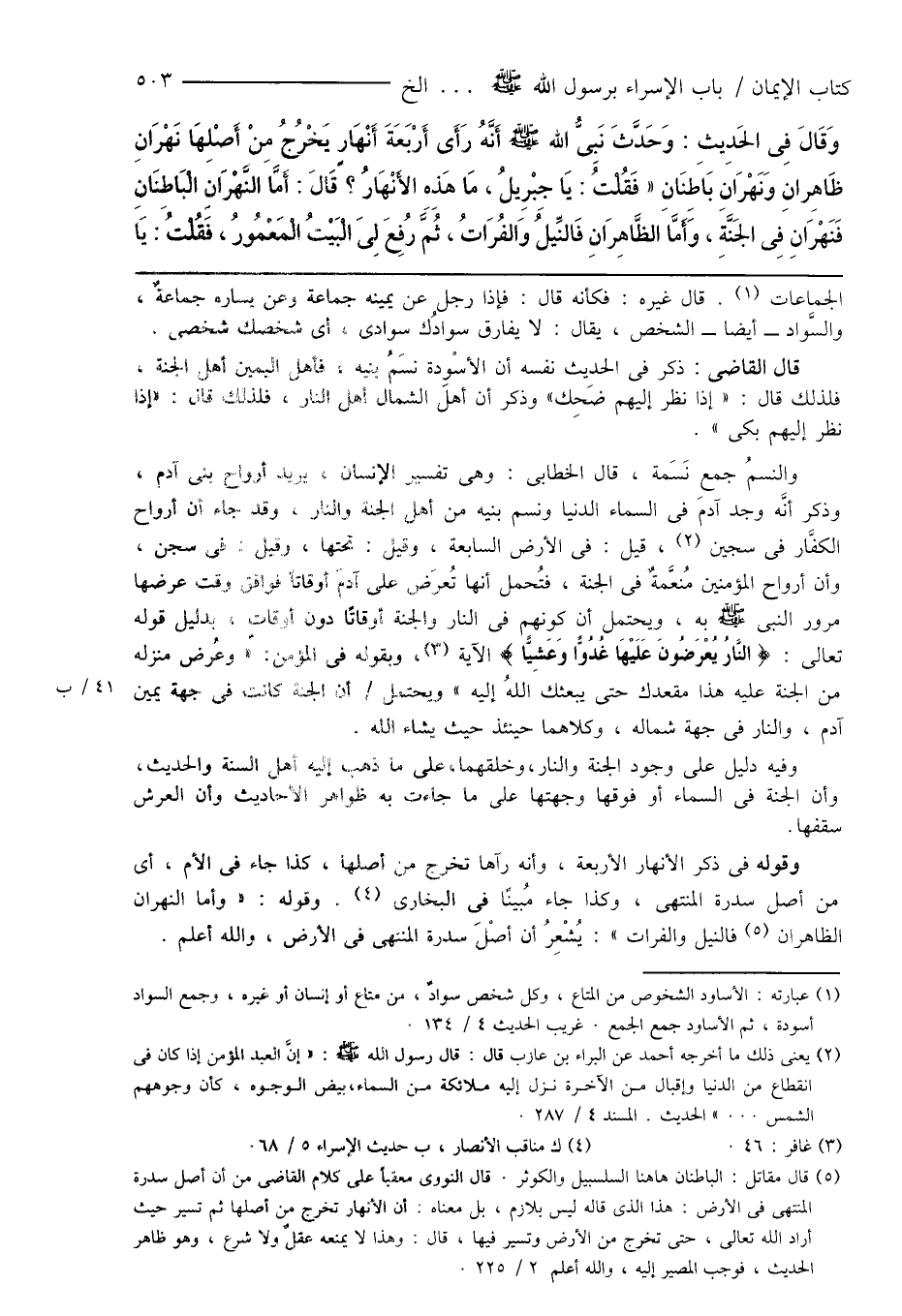 وقوله فى ذكر الأنهار الأربعة، وأنه رآها تخرج من أصلها، كذا جاء فى الأم، أى من أصل سدرة المنتهى، وكذا جاء مُبينًا فى البخارى (¬4). وقوله: " وأما النهران الظاهران (¬5) فالنيل والفرات ": يُشْعِرُ أن أصْلَ سدرة المنتهى فى الأرض، والله أعلم.
