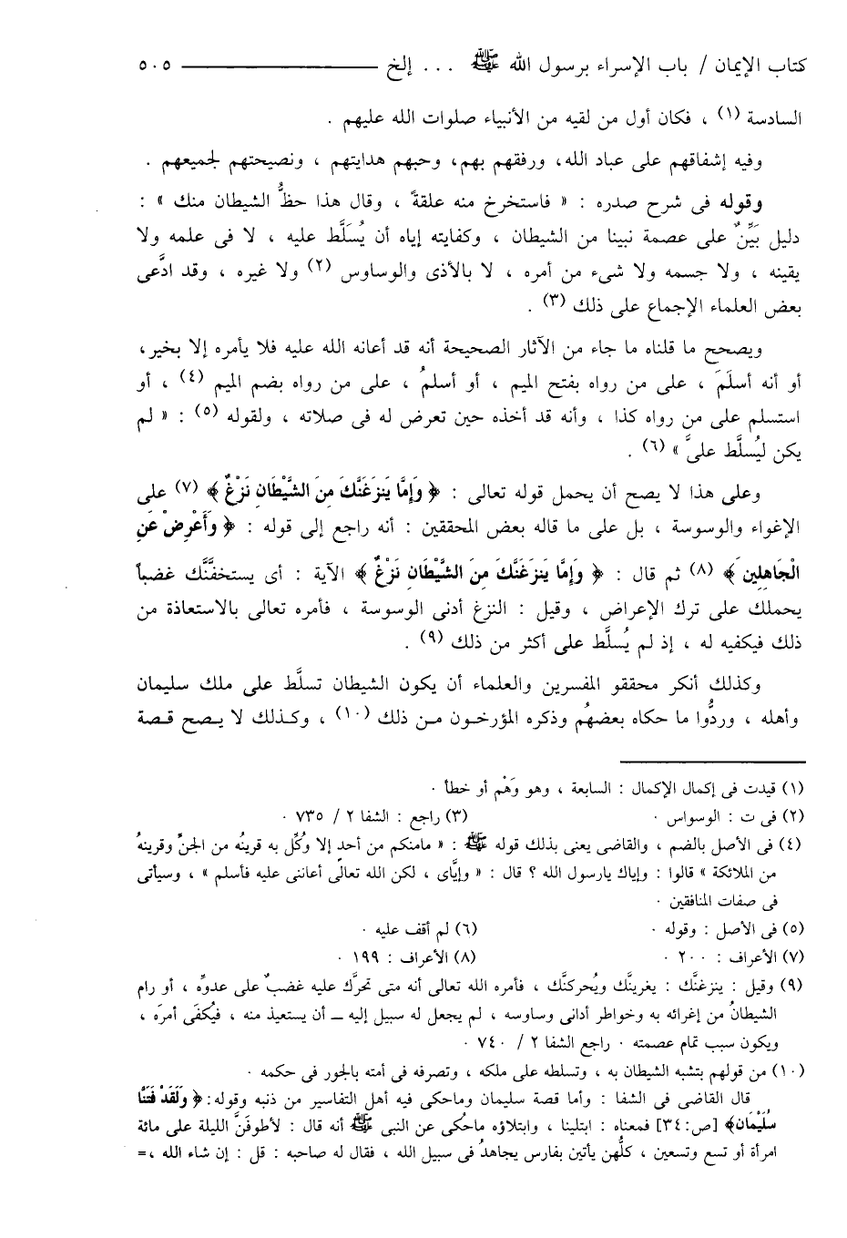 (¬10) من قولهم بتشبه الشيطان به، وتسلطه على ملكه، وتصرفه فى أمته بالجور فى حكمه. قال القاضى فى الشفا: وأما قصة سليمان وما حكى فيه أهل التفاسير من ذنبه وقوله: {وَلَقَدْ فَتَنَّا سُلَيْمَان} [ص: 34] فمعناه: ابتلينا، وابتلاؤه ما حُكى عن النبى صَلَّى اللهُ عَلَيْهِ وَسَلَّمَ أنه قال: لأطوفَنَّ الليلة على مائة امرأة أو تسع وتسعين، كلُّهن يأتين بفارس يجاهدُ فى سبيل الله، فقال له صاحبه: قل: إن شاء الله، =