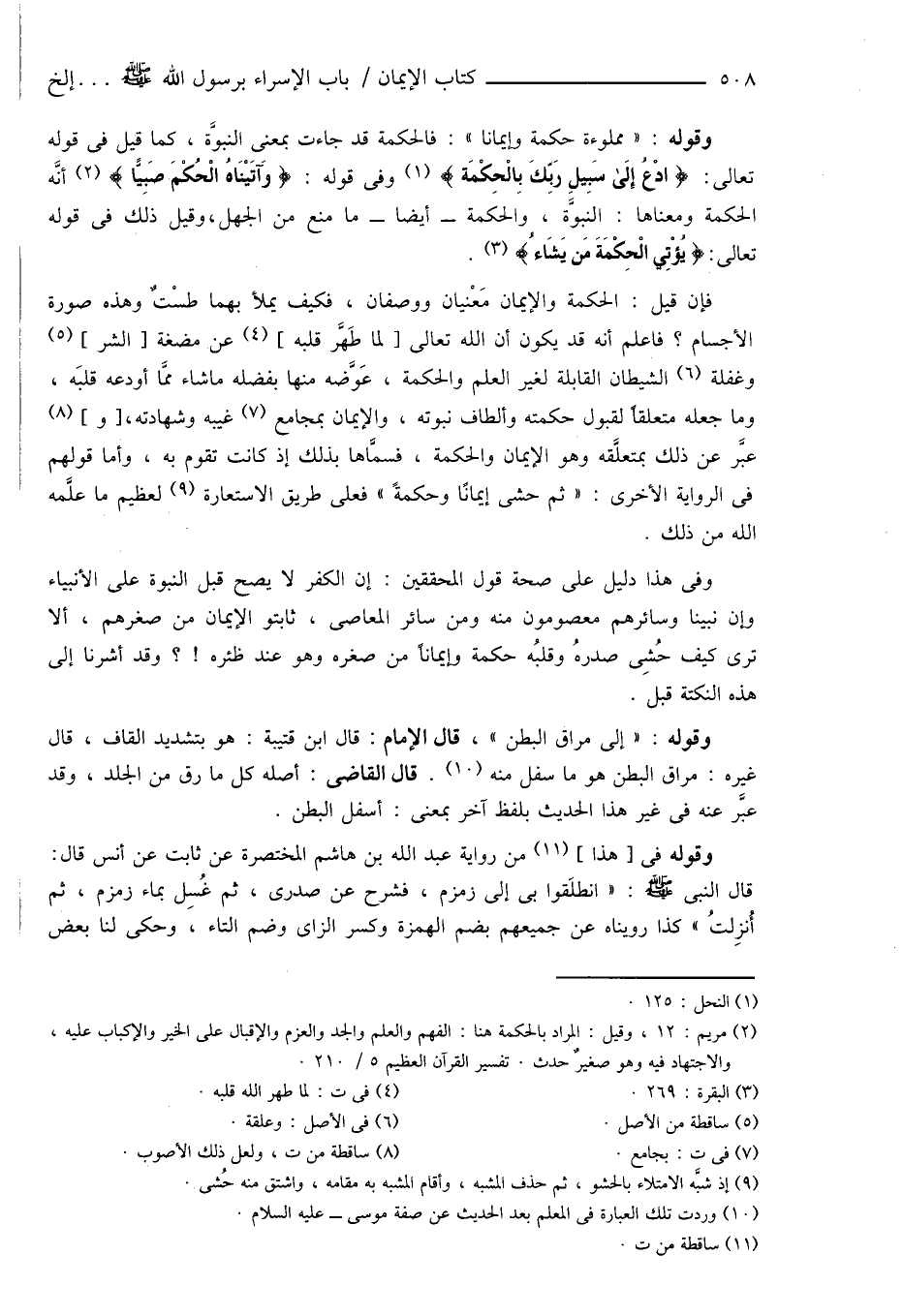وقوله: " مملوءة حكمة وإيماناً ": فالحكمة قد جاءت بمعنى النبوَّة، كما قيل فى قوله تعالى: {ادْعُ إِلَى سَبِيلِ رَبِّكَ بِالْحِكْمَة} (¬1) وفى قوله: {وَآتَيْنَاهُ الْحُكْمَ صَبِيًّا} (¬2) أنَّه الحكمة ومعناها: النبوَّة، والحكمة - أيضاً - ما منع من الجهل، وقيل ذلك فى قوله تعالى: {يُؤْتِي الْحِكْمَةَ مَن يَشَاءُ} (¬3). فإن قيل: الحكمة والإيمان مَعْنيان ووصفان، فكيف يملأ بهما طسْتٌ وهذه صورة الأجسام؟ فاعلم أنه قد يكون أن الله تعالى [لما طَهَّر قلبه] (¬4) عن مضغة [الشر] (¬5) وغفلة (¬6) الشيطان القابلة لغير العلم والحكمة، عَوَّضه منها بفضله ما شاء ممَّا أودعه قلبَه، وما جعله متعلقاً لقبول حكمته وألطاف نبوته، والإيمان بمجامع (¬7) غيبه وشهادته، [و] (¬8) عبَّر عن ذلك بمتعلَّقه وهو الإيمان والحكمة، فسمَّاها بذلك إذ كانت تقوم به، وأما قولهم فى الرواية الأخرى: " ثم حشى إيمانًا وحكمةً " فعلى طريق الاستعارة (¬9) لعظيم ما علَّمه الله من ذلك.