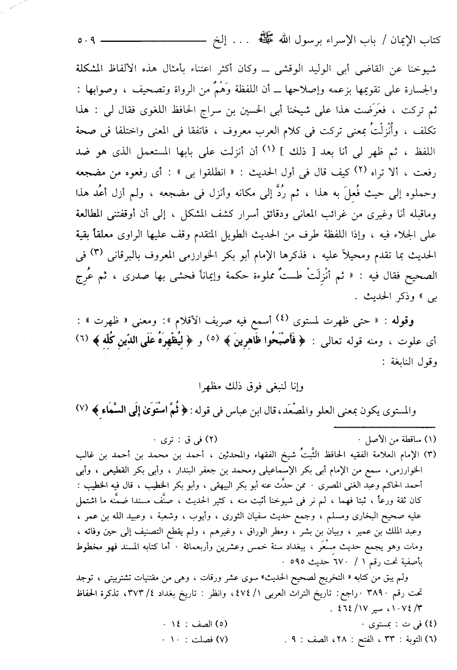 شيوخنا عن القاضى أبى الوليد الوقشى - وكان أكثر اعتناء بأمثال هذه الألفاظ المشكلة والجسارة على تقويمها بزعمه وإصلاحها - أن اللفظة وَهْمٌ من الرواة وتصحيف، وصوابها: ثم تركت، فعَرَضت هذا على شيخنا أبى الحسين بن سراج الحافظ اللغوى فقال لى: هذا تكلف، وأُنْزلْتُ بمعنى تركت فى كلام العرب معروف، فاتفقا فى المعنى واختلفا فى صحة اللفظ، ثم ظهر لى أنا بعد [ذلك] (¬1) أن أنزلت على بابها المستعمل الذى هو ضد رفعت، ألا تراه (¬2) كيف قال فى أول الحديث: " انطلقوا بى ": أى رفعوه من مضجعه وحملوه إلى حيث فُعِلَ به هذا، ثم رُدَّ إلى مكانه وأنزل فى مضجعه، ولم أزل أعُد هذا وما قبله أنا وغيرى من غرائب المعانى ودقائق أسرار كشف المشكل، إلى أن أوقفتنى المطالعة على الجلاء فيه، وإذا اللفظة طرف من الحديث الطويل المتقدم وقف عليها الراوى معلقاً بقية الحديث بما تقدم ومحيلاً عليه، فذكرها الإمام أبو بكر الخوارزمى المعروف بالبرقانى (¬3) فى الصحيح فقال فيه: " ثم أنْزِلَتْ طستٌ مملوءة حكمة وإيماناً فحشى بها صدرى، ثم عُرِج بى " وذكر الحديث.