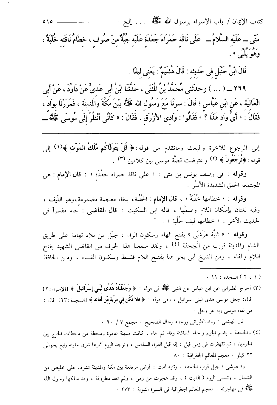 (¬3) أخرج الطبرانى عن ابن عباس عن النبى صَلَّى اللهُ عَلَيْهِ وَسَلَّمَ قوله: {وَجَعَلْنَاهُ هُدًى لِّبَنِي إِسْرَائِيلَ} [الإسراء: 2] قال: جعل موسى عدى لبنى إسرائيل، وفى قوله: {فَلا تَكُن فِي مِرْيَةٍ مِّن لِّقَائِهِ} [السجدة: 23] قال: من لقاء موسى ربه عز وجل.