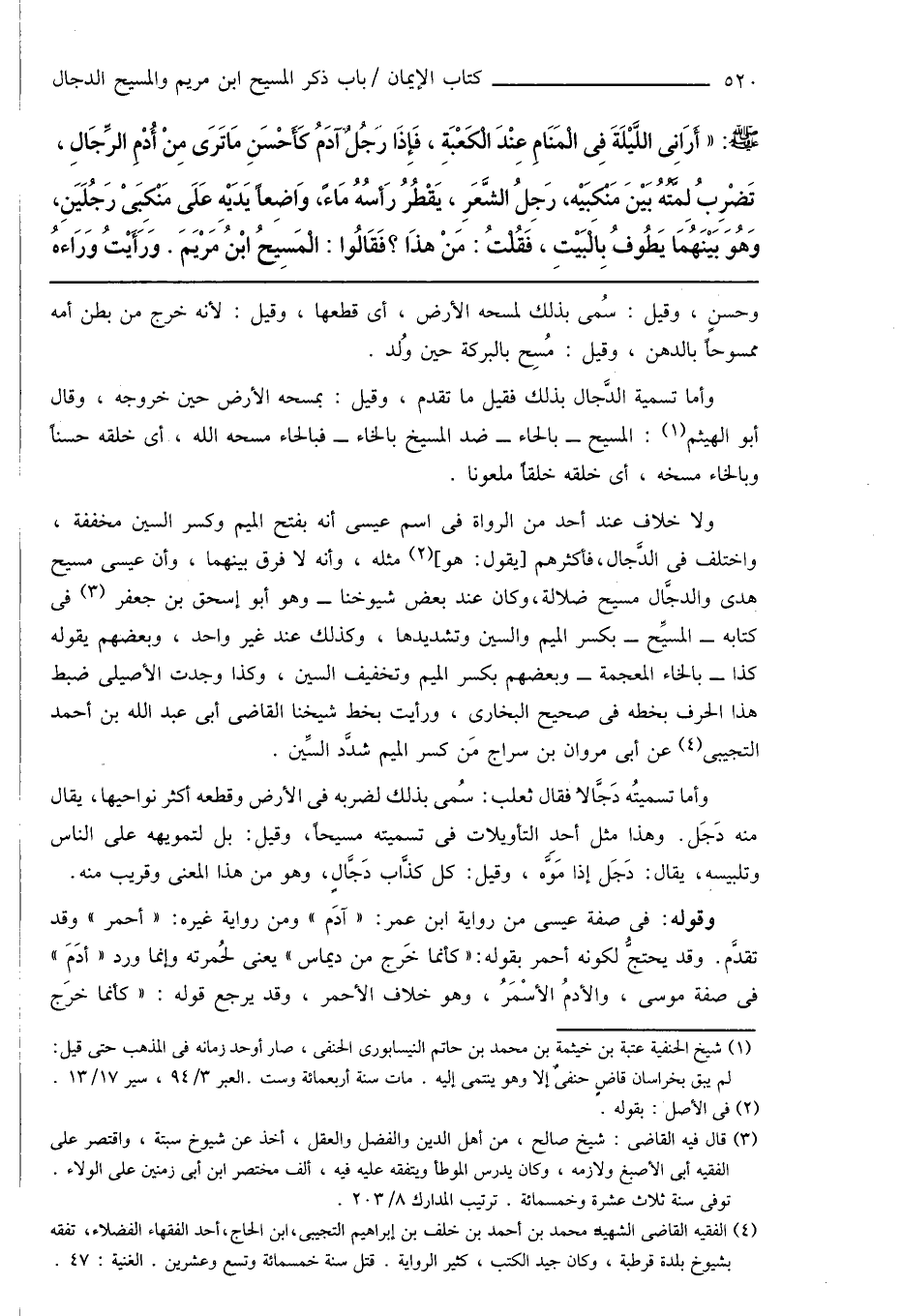 ولا خلاف عند أحد من الرواة فى اسم عيسى أنه بفتح الميم وكسر السين مخففة، واختلف فى الدَّجال، فأكثرهم [يقول: هو] (¬2) مثله، وأنه لا فرق بينهما، وأن عيسى مسيح هدى والدجَّال مسيح ضلالة، وكان عند بعض شيوخنا - وهو أبو إسحاق بن جعفر (¬3) فى كتابه - المسيِّح - بكسر الميم والسين وتشديدها، وكذلك عند غير واحد، وبعضهم يقوله كذا - بالخاء المعجمة - وبعضهم بكسر الميم وتخفيف السين، وكذا وجدت الأصيلى ضبط هذا الحرف بخطه فى صحيح البخارى، ورأيت بخط شيخنا القاضى أبى عبد الله بن أحمد التجيبى (¬4) عن أبى مروان بن سراج مَن كسر الميم شدَّد السِّين.