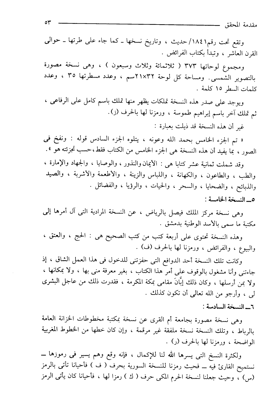 ولكثرة النسخ التى يسرها الله لنا للإكمال، فإنه وقع وهم يسير فى رموزها - نستميح القارئ فيه - فحيث رمزنا للنسخة السورية بحرف (ف) فأحياناً تأتى بالرمز (س)، وحيث جعلنا لنسخة الحرم المكى حرف (ك) رمزاً لها، فأحياناً كان يأتى الرمز