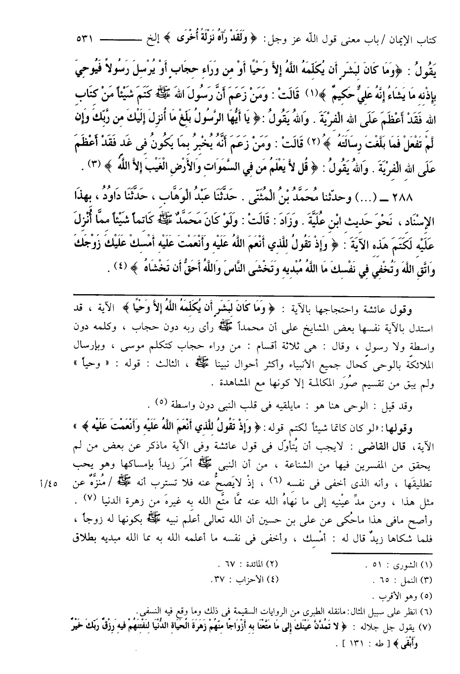 288 - (...) وحدّثنا مُحَمَّدُ بْنُ الْمُثَنَّى. حَدَّثَنَا عَبْدُ الْوَهَّابِ، حَدَّثَنَا دَاوُدُ، بِهذَا الإِسْنَادِ، نَحْوَ حَدِيثِ ابْنِ عُلَيَّةَ. وَزَادَ: قَالَتْ: وَلَوْ كَانَ مَحَمَّدٌ صَلَّى اللهُ عَلَيْهِ وَسَلَّمَ كَاتِماً شَيْئًا مِمَّا أُنزِلَ عَلَيْهِ لَكَتَمَ هَذِهِ الآيَةَ: {وَإِذْ تَقُولُ لِلَّذِي أَنْعَمَ اللَّهُ عَلَيْهِ وَأَنْعَمْتَ عَلَيْهِ أَمْسَكْ عَلَيْكَ زَوْجَكَ وَاتَّقِ اللَّهَ وَتُخْفِي فِي نَفْسِكَ مَا اللَّهُ مُبْدِيهِ وَتَخْشَى النَّاسَ وَاللَّهُ أَحَقُّ أن تَخْشَاهُ} (¬4).