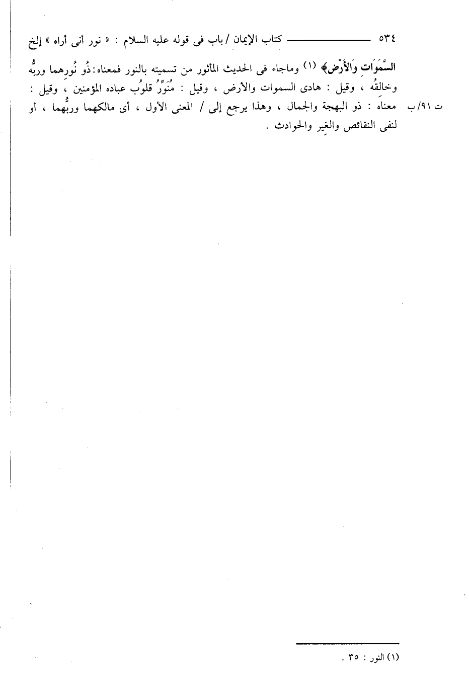 السَّمَوَاتِ وَالأَرْض} (¬1) وما جاء فى الحديث المأثور من تسميته بالنور فمعناه: ذُو نُورِهما وربُّه وخالِقُه، وقيل: هادى السماوات والأرض، وقيل: مُنَوِّرُ قلوُب عباده المؤمنين، وقيل: معناه: ذو البهجة والجمال، وهذا يرجع إلى المعنى الأول، أى مالكهما وربُّهما، أو لنفى النقائص والغِير والحوادث.