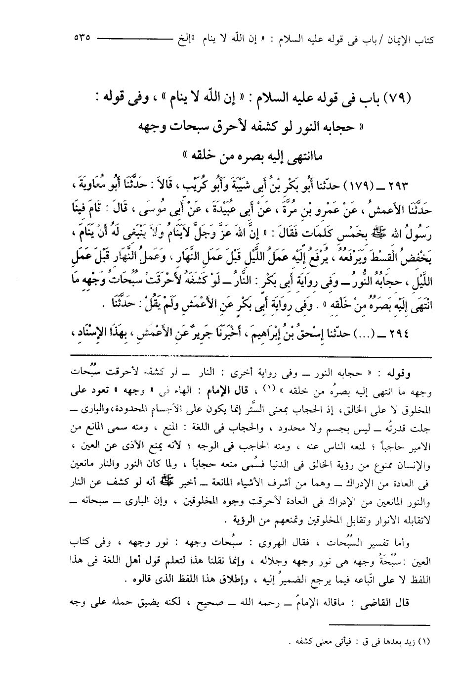 (79) باب فى قوله عليه السلام: " إن الله لا ينام "، وفى قوله: " حجابه النور لو كشفه لأحرق سبحات وجهه ما انتهى إليه بصره من خلقه "