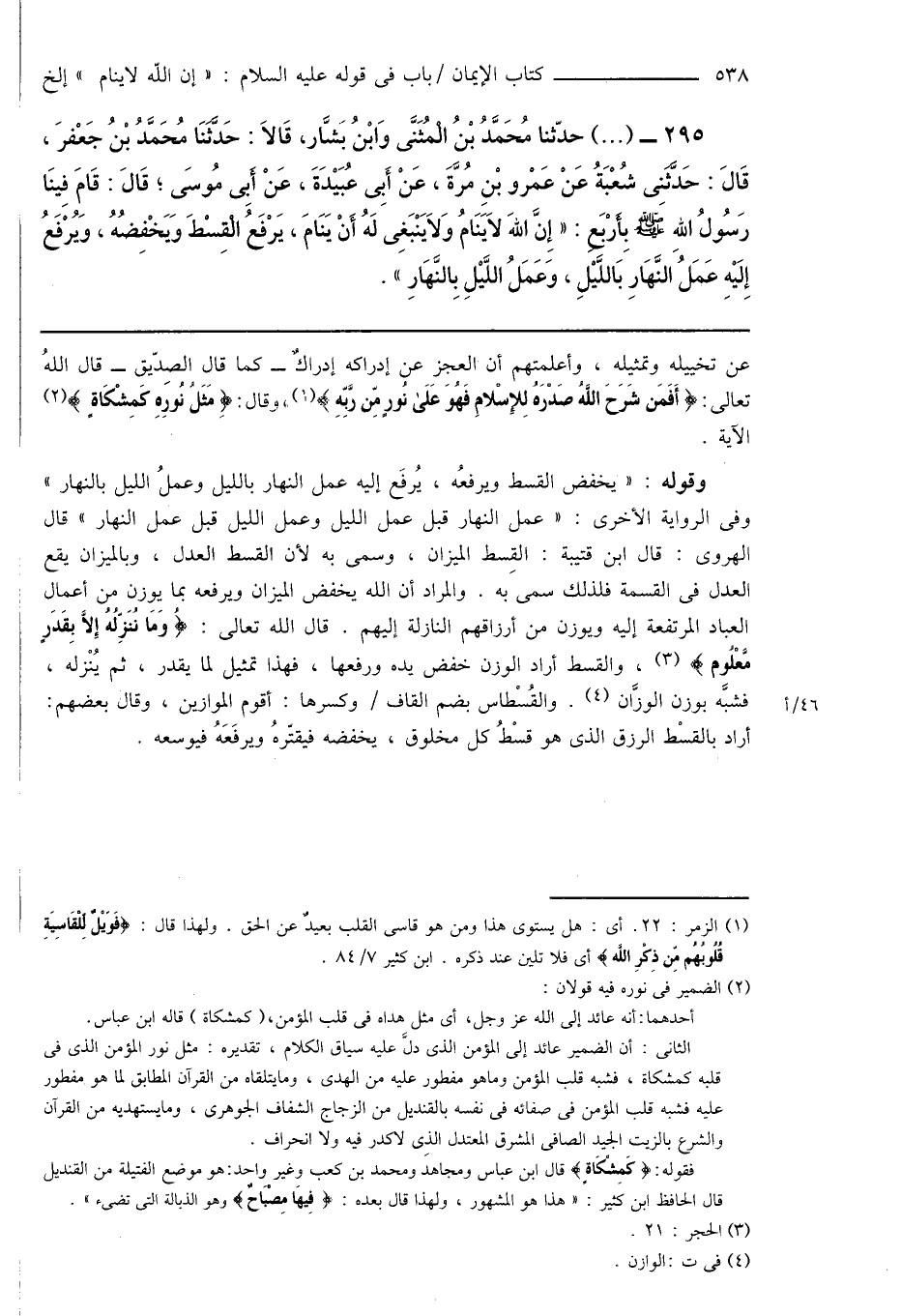وقوله: " يخفض القسط ويرفعُه، يُرفَع إليه عمل النهار بالليل وعملُ الليل بالنهار " وفى الرواية الأخرى: " عمل النهار قبل عمل الليل وعمل الليل قبل عمل النهار " قال الهروى: قال ابن قتيبة: القِسط الميزان، وسمى به لأن القسط العدل، وبالميزان يقع العدل فى القسمة فلذلك سمى به. والمراد أن الله يخفض الميزان ويرفعه بما يوزن من أعمال العباد المرتفعة إليه ويوزن من أرزاقهم النازلة إليهم. قال الله تعالى: {وَمَا نُنَزِّلُهُ إِلَّا بِقَدَرٍ مَّعْلُوم} (¬3)، والقسط أراد الوزن خفض يده ورفعها، فهذا تمثيل لما يقدر، ثم يُنْزله، فشبَّه بوزن الوزَّان (¬4). والقُسْطاس بضم القاف وكسرها: أقوم الموازين، وقال بعضهم: أراد بالقسْط الرزق الذى هو قسْطُ كل مخلوق، يخفضه فيقتّرهُ ويرفَعَهُ فيوسعه.