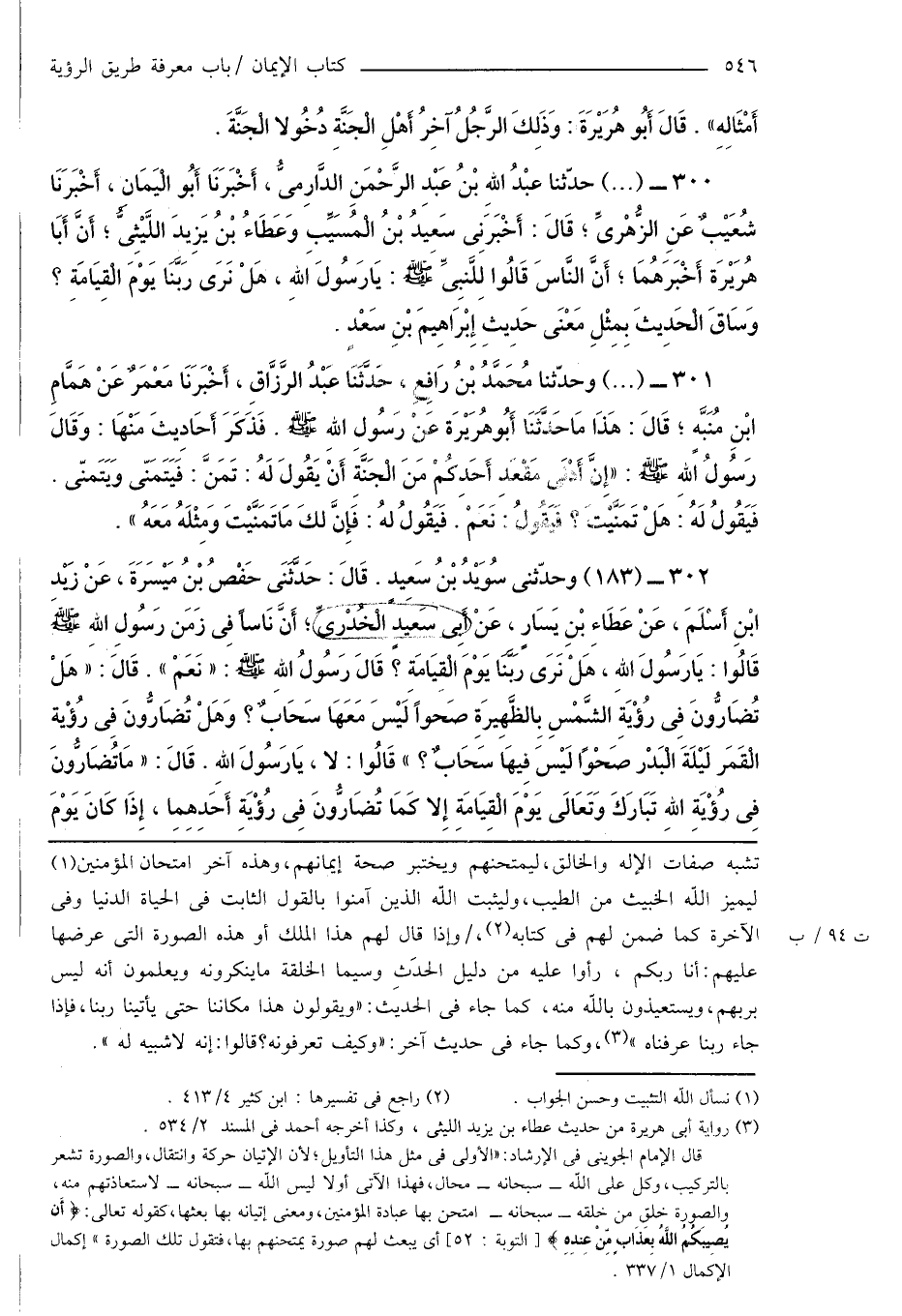 300 - (...) حدّثنا عبْدُ اللهِ بْنُ عَبْدِ الرَّحْمَنِ الدَّارِمىُّ، أَخْبَرَنَا أَبُو الْيَمَانِ، أَخْبَرَنَا شُعَيْبٌ عَنِ الزُّهْرىِّ؛ قَالَ: أَخْبَرَنِى سَعِيدُ بْنُ الْمُسَيِّبِ وَعَطَاءُ بْنُ يَزِيدَ اللَّيْثِىُّ؛ أَنَّ أَبَا هُرَيْرَة أَخْبَرَهُمَا؛ أَنَّ النَّاسَ قَالُوا لِلنَّبِىِّ صَلَّى اللهُ عَلَيْهِ وَسَلَّمَ: يَا رَسُولَ اللهِ، هَلْ نَرَى رَبَّنَا يَوْمَ الْقِيَامَةِ؟ وَسَاقَ الْحَدِيثَ بِمِثْلِ مَعْنَى حَدِيثِ إِبْرَاهِيمَ بْنِ سَعْدٍ.