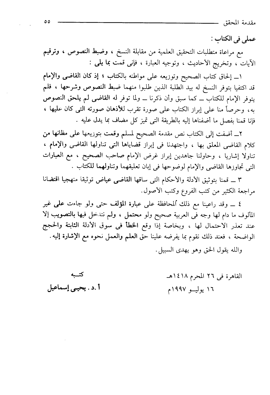 2 - أضفت إلى الكتاب نص مقدمة الصحيح لمسلم وقمت بتوزيعها على مظانها من كلام القاضى المعلق بها، واجتهدنا فى إبراز قضاياها التى تناولها القاضى والإمام، تناولاً إشارياً، وحاولنا جاهدين إبراز غرض الإمام صاحب الصحيح، مع العبارات التى تجاوزها القاضى والإمام لوضوحها فى إبان تعليقهما وتناولهما للكتاب.