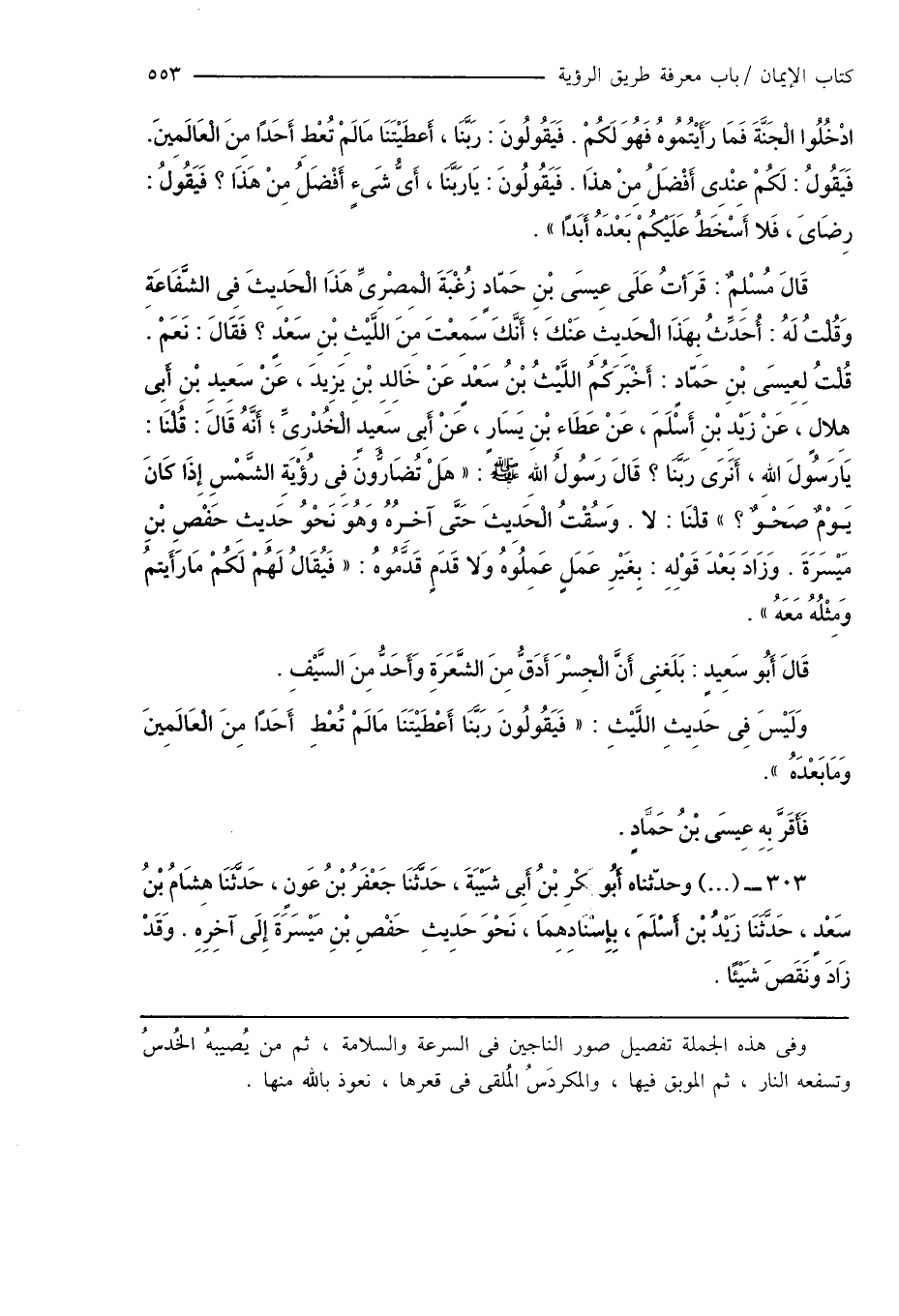 قَالَ مُسْلِمٌ: قَرَأتُ عَلَى عِيسَى بْنِ حَمَّادٍ زُغْبَةَ الْمِصْرِىِّ هَذَا الْحَدِيثَ فِى الشَّفَاعَةِ وَقُلْتُ لَهُ: أُحَدِّثُ بِهَذَا الْحَدِيثِ عَنْكَ؟ أَنَّكَ سَمِعْتَ مِنَ اللَّيْثِ بْنِ سَعْدٍ؟ فَقَالَ: نَعَمْ. قُلْتُ لِعِيسَى بْنِ حَمّادٍ: أَخْبَرَكُمُ اللَّيْثُ بْنُ سَعْدٍ عَنْ خَالِدِ بْنِ يَزِيدَ، عَنْ سَعِيدِ بْنِ أَبِى هِلالٍ، عَنْ زَيْدِ بْنِ أَسْلَمَ، عَنْ عَطَاءِ بْنِ يَسَارٍ، عَنْ أَبِى سَعِيدٍ الْخُدْرِىِّ؛ أَنَّهُ قَالَ: قُلْنَا: يَا رَسُولَ اللهِ، أَنَرَى رَبَّنَا؟ قَالَ رَسُولُ اللهِ صَلَّى اللهُ عَلَيْهِ وَسَلَّمَ: " هَلْ تُضَارُّونَ فِى رُؤْيَةِ الشَّمْسِ إِذَا كَانَ يَوْمٌ صَحْوٌ؟ " قلْنَا: لا. وَسُقْتُ الْحَدِيثَ حَتَّى آخِرُهُ وَهُوَ نَحْوُ حَدِيثِ حَفْصِ بْنِ مَيْسَرَةَ. وَزَادَ بَعْدَ قَوْلِهِ: بِغَيْرِ عَمَلٍ عَمِلُوهُ وَلا قَدَمٍ قَدَّمُوهُ: " فَيُقَالُ لَهُمْ لَكُمْ مَا رَأَيتمُ وَمِثْلُهُ مَعَهُ ".