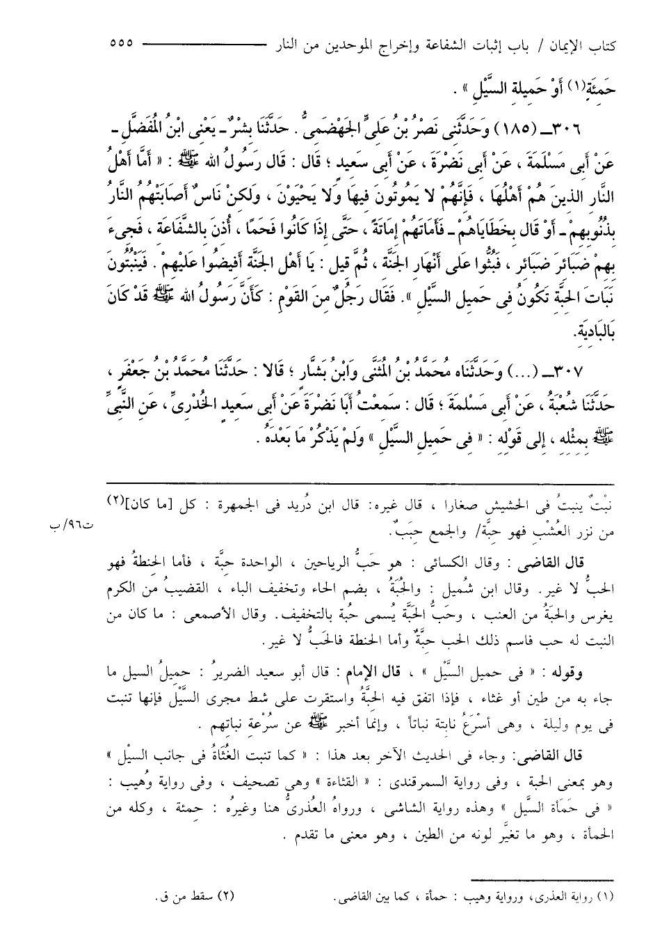 306 - (185) وَحَدَّثَنِى نَصْرُ بْنُ عَلِىٍّ الجَهْضَمِىُّ. حَدَّثَنَا بِشْرٌ - يَعْنِى ابْنُ المُفَضَّلِ - عَنْ أَبِى مَسْلَمَةَ، عَنْ أَبِى نَضْرَةَ، عَنْ أَبِى سَعِيدٍ؛ قَال: قَال رَسُولُ الله صَلَّى اللهُ عَلَيْهِ وَسَلَّمَ: " أَمَّا أَهْلُ النَّارِ الَّذِينَ هُمْ أَهْلُهَا، فَإِنَّهُمْ لا يَمُوتُونَ فِيهَا وَلا يَحْيَوْنَ، وَلكِنْ نَاسٌ أَصَابَتْهُمُ النَّارُ بِذُنُوبِهِمْ - أَوْ قَال بِخَطَايَاهُمْ - فَأَمَاتَهُمْ إِمَاتَةً، حَتَّى إِذَا كَانُوا فَحَمًا، أُذِنَ بِالشَّفَاعَةِ، فَجِىءَ بِهِمْ ضَبَائِرَ ضَبَائِر، فَبُثُّوا عَلى أَنْهَارِ الجَنَّةِ، ثُمَّ قِيل: يَا أَهْل الجَنَّةِ أَفِيضُوا عَليْهِمْ. فَيَنْبُتُونَ نَبَاتَ الحِبَّةِ تَكُونُ فِى حَمِيل السَّيْلِ ". فَقَالَ رَجُلٌ مِنَ القَوْمِ: كَأَنَّ رَسُولُ الله صَلَّى اللهُ عَلَيْهِ وَسَلَّمَ قَدْ كَانَ بَالبَادِيَةِ.
