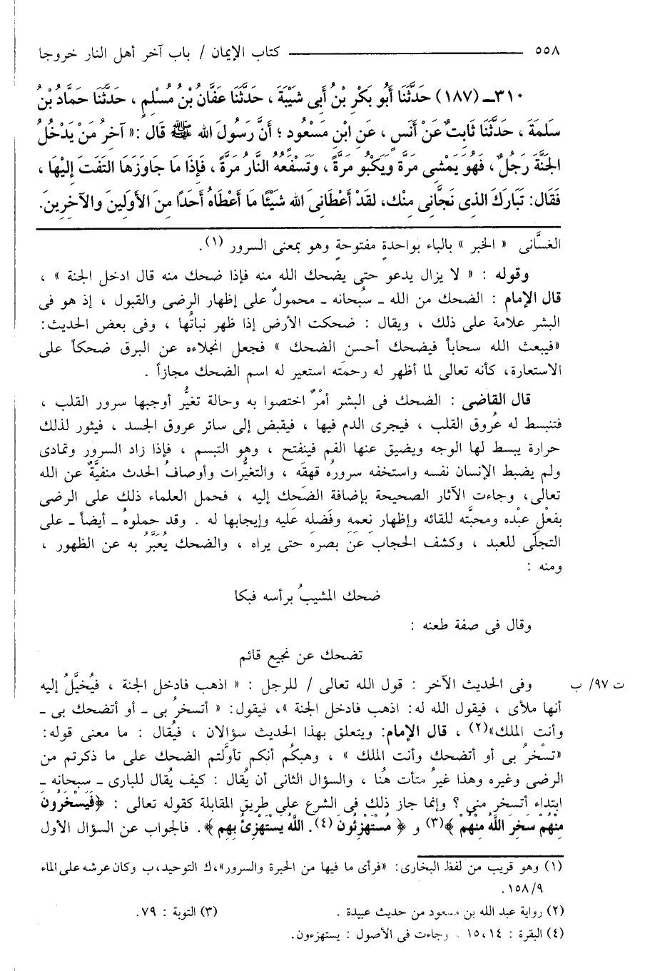 وقوله: " لا يزال يدعو حتى يضحك الله منه فإذا ضحك منه قال ادخل الجنة "، قال الإمام: الضحك من الله - سُبحانه - محمولٌ على إظهار الرضى والقبول، إذ هو فى البشر علامة على ذلك، ويقال: ضحكت الأرض إذا ظهر نباتُها، وفى بعض الحديث: " فيبعث الله سحاباً فيضحك أحسن الضحك " فجعل انجلاءه عن البرق ضحكاً على الاستعارة، كأنه تعالى لما أظهر له رحمَته استعير له اسم الضحك مجازاً.