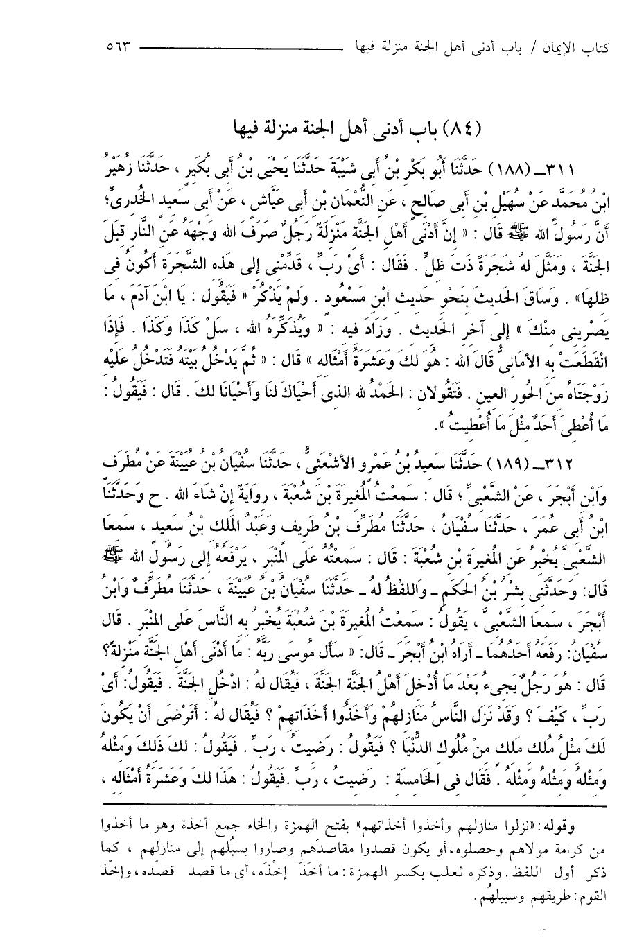 311 - (188) حَدَّثَنَا أَبُو بَكْرِ بْنُ أَبِى شَيْبَةَ حَدَّثَنَا يَحْيَى بْنُ أَبِى بُكَيِرٍ، حَدَّثَنَا زُهَيْرُ ابْنُ مُحَمَّدٍ عَنْ سُهَيْلِ بْنِ أَبِى صَالِحٍ، عَنِ النُّعْمَانِ بْنِ أَبِى عَيَّاشٍ، عَنْ أَبِى سَعِيدٍ الخُدِرىِّ؛ أَنَّ رَسُولَ الله صَلَّى اللهُ عَلَيْهِ وَسَلَّمَ قَال: " إِنَّ أَدْنَى أَهْلِ الجَنَّةِ مَنْزِلَةً رَجُلٌ صَرَفَ الله وَجْهَهُ عَنِ النَّارِ قِبَلَ الجَنَّةَ، وَمَثَّلَ لهُ شَجَرَةً ذَاتَ ظِلٍّ. فَقَالَ: أَىْ رَبِّ، قَدِّمْنِى إِلى هَذِهِ الشَّجَرَةِ أَكُونُ فِى ظِلهَا ". وَسَاقَ الحَدِيثَ بنَحْوِ حَدِيثِ ابْنِ مَسْعُودٍ. وَلمْ يَذْكُرْ " فَيَقُول: يَا ابْنَ آدَمَ، مَا يَصْرِينِى مِنْكَ " إلى آخِرِ الحَدِيثِ. وَزَادَ فِيهِ: " وَيُذَكِّرَهُ الله، سَلْ كَذَا وَكَذَا. فَإِذَا انْقَطَعَتْ بِهِ الأَمَانِىُّ قَالَ الله: هُوَ لكَ وَعَشَرَةُ أَمْثَالِهِ " قَال: " ثُمَّ يَدْخُلُ بَيْتَهُ فَتَدْخُلُ عَلَيْهِ زَوْجَتَاهُ مِنَ الحُورِ العِينِ. فَتَقُولانِ: الحَمْدُ لله الذِى أَحْيَاكَ لنَا وَأَحْيَانَا لكَ. قَال: فَيَقُولُ: مَا أُعْطِىَ أَحَدٌ مِثْلَ مَا أُعْطِيتُ ".