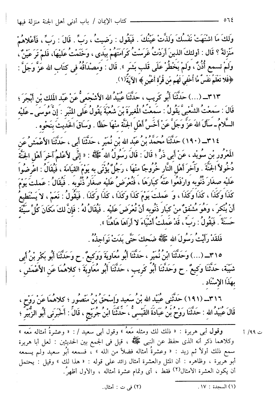 314 - (190) حَدَّثَنَا مُحَمَّدُ بْنُ عَبْدِ اللهِ بْنِ نُمَيْرٍ، حَدَّثَنَا أَبِى، حَدَّثَنَا الأَعْمَشُ عَنِ المَعْرُورِ بْن سُويْدٍ، عَنْ أَبِى ذَرٍّ؛ قَالَ: قَالَ رَسُولُ اللهِ صَلَّى اللهُ عَلَيْهِ وَسَلَّمَ: " إِنِّى لأَعْلمُ آخِرَ أَهْلِ الجَنَّةِ دُخُولاً الجَنُّةَ. وآخِرَ أَهْلِ النَّارِ خُرُوجًا مِنْهَا، رَجُلٌ يُؤْتَى بِهِ يَوْمَ القِيَامَةِ، فَيُقَالُ: اعْرِضُوا عَليْهِ صِغَارَ ذُنُوبِهِ وارْفَعُوا عَنْهُ كِبَارَهَا، فَتُعْرَضُ عَليْهِ صِغَارُ ذُنُوبِهِ. فَيُقَالُ: عَمِلتَ يَوْمَ كَذَاَ وَكَذَا، كَذَا وَكَذَا، وَعَمِلتَ يَوْمَ كَذَا وَكَذَا، كَذَا وَكَذَا. فَيَقُولُ: نَعَمْ، لَا يَسْتَطِيعُ أَنْ يُنْكِرَ، وَهُوَ مُشْفِقٌ مِنْ كِبَارِ ذنُوبِهِ أَنْ تُعْرَضَ عَليْهِ. فَيُقَالُ لهُ: فَإِنَّ لكَ مَكَانَ كُلِّ سَيِّئَةٍ حَسَنَةً. فَيَقُولُ: رَبِّ، قَدْ عَمِلتُ أَشْيَاءَ لا أَرَاهَا هَاهُنَا ".