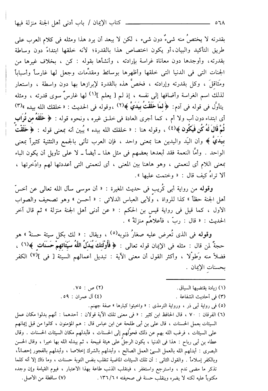 (¬6) الفرقان: 70، قال الحافظ ابن كثير: " فى معنى تلك الآية قولان: أحدهما: أنهم بدلوا مكان عمل السيئات بعمل الحسنات، قال على بن أبى طلحة عن ابن عباس قال: هم المؤمنون، كانوا من قبل إيمانهم على السيئات، فرغب الله بهم عن ذلك فحوَّلهم إلى الحسنات، فأبدلهم مكان السيئات الحسنات. وقال عطاء بن أبى رباح: هذا فى الدنيا، يكون الرجلُ على هيئة قبيحة، ثم يبدله الله بها خيراً، وقال الحسن البصرى: أبدلهم الله بالعمل السيئ العمل الصالح، وأبدلهم بالشرك إخلاصاً، وأبدلهم بالفجور إحصاناً، وبالكفر إسلاماً. والقول الثانى: أن تلك السيئات الماضية تقلب بنفس التوبة حسنات، وما ذاك إلا أنه كلما تذكر ما مضى ندم، واسترجع واستغفر، فينقلب الذنب طاعة بهذا الاعتبار، فيوم القيامة وإن وجده مكتوباً عليه لكنه لا يضره ويقلب حسنة فى صحيفته " 6/ 136.