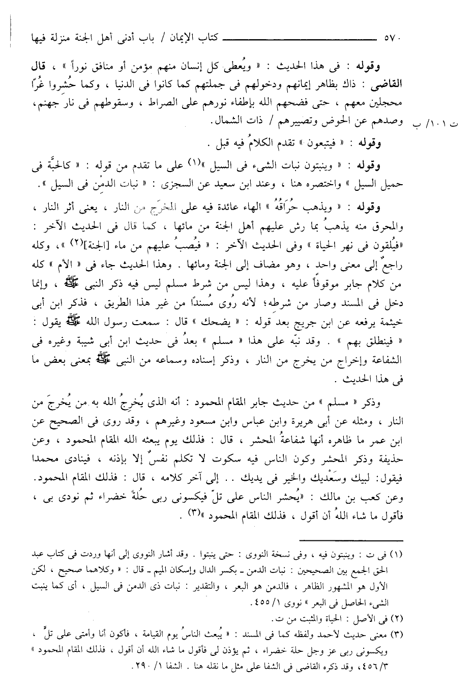 (¬3) معنى حديث لأحمد ولفظه كما فى المسند: " يُبعث الناسُ يوم القيامة، فأكون أنا وأمتى على تلٍّ، ويكسونى ربى عز وجل حلة خضراء، ثم يؤذن لى فأقول ما شاء الله أن أقول، فذلك المقام المحمود " 3/ 456، وقد ذكره القاضى فى الشفا على مثل ما نقله هنا. الشفا 1/ 290.