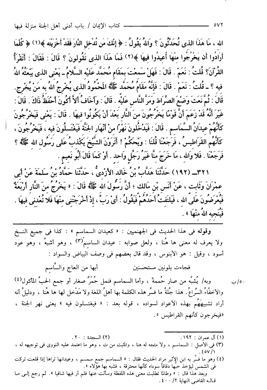 321 - (192) حَدَّثَنَا هَدَّابُ بْنُ خَالِدٍ الأَزْدِىُّ، حَدَّثَنَا حَمَّادُ بْنُ سَلمَةَ عَنْ أَبِى عِمْرَانَ وَثَابِتٍ، عَنْ أَنَسِ بْنِ مَالِكٍ؛ أَنَّ رَسُولَ اللهِ صَلَّى اللهُ عَلَيْهِ وَسَلَّمَ قَالَ: " يَخْرُجُ مِنَ النَّارِ أَرْبَعَةٌ فَيُعْرَضُونَ عَلى اللهِ، فَيَلتَفِتُ أَحَدُهُمْ فَيَقُولُ: أَىْ رَبِّ، إِذْ أَخْرَجْتَنِى مِنْهَا فَلا تُعْدِنِى فِيهَا. فَيُنَجِيهِ اللهُ مِنْهَا ".