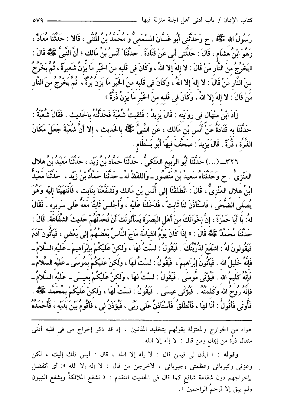 رَسُولُ اللهِ صَلَّى اللهُ عَلَيْهِ وَسَلَّمَ. ح وَحَدَّثَنِى أَبُو غَسَّانَ المِسْمَعِىُّ وَمُحَمَّدُ بْنُ المُثَنَّى، قَالا: حَدَّثَنَا مُعَاذٌ، وَهُوَ ابْنُ هِشَامٍ، قَالَ: حَدَّثَنِى أَبِى عَنْ قَتَادَةَ. حَدَّثَنَا أَنَسُ بْنُ مَالِكٍ؛ أَنَّ النَّبِىَّ صَلَّى اللهُ عَلَيْهِ وَسَلَّمَ قَالَ: " يَخْرُجُ مِنَ النَّارِ مَنْ قَالَ: لا إِلهَ إِلا اللهُ، وَكَانَ فِى قَلبِهِ مِنَ الخَيْرِ مَا يَزِنُ شَعِيرَةً، ثُمَّ يَخْرُجُ مِنَ النَّارِ مَنْ قَالَ: لا إِلهَ إِلا اللهُ، وَكَانَ فِى قَلبِهِ مِنَ الخَيْرِ مَا يَزِنُ بُرَّةٌ، ثُمَّ يَخْرُجُ مِنَ النَّارِ مَنْ قَالَ: لا إِلهَ إِلا اللهُ، وَكَانَ فِى قَلبِهِ مِنَ الخَيْرِ مَا يَزِنُ ذَرَّةٌ ".
