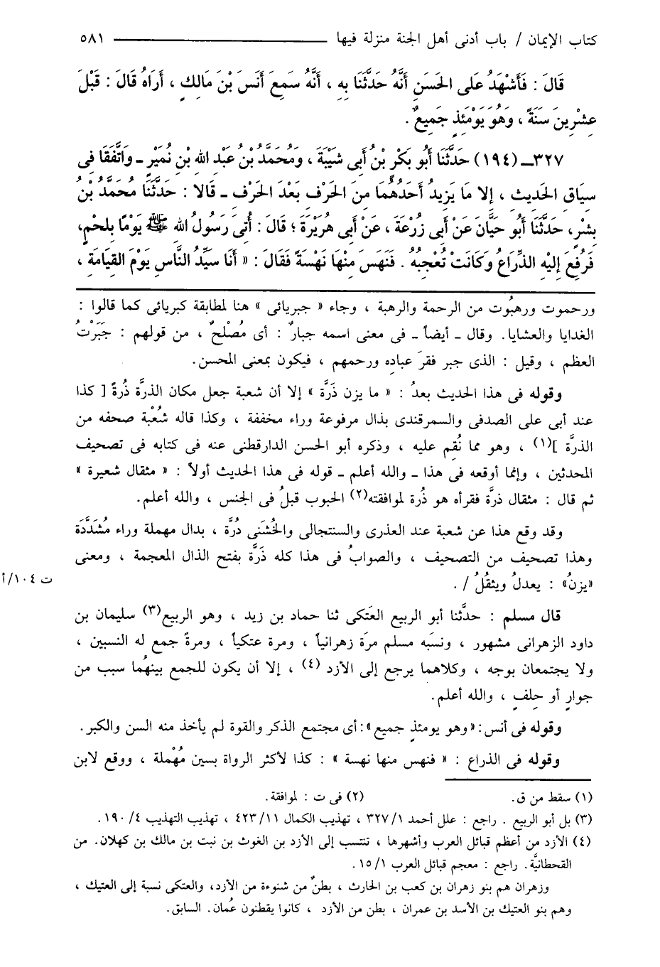قال مسلم: حدَّثنا أبو الربيع العَتكى ثنا حماد بن زيد، وهو الربيع (¬3) سليمان بن داود الزهرانى مشهور، ونسَبه مسلم مرَّة زهرانياً، ومرة عتكياً، ومرةً جمع له النسبين، ولا يجتمعان بوجه، وكلاهما يرجع إلى الأزد (¬4)، إلا أن يكون للجمع بينهُما سبب من جوارٍ أو حِلفٍ، والله أعلم.