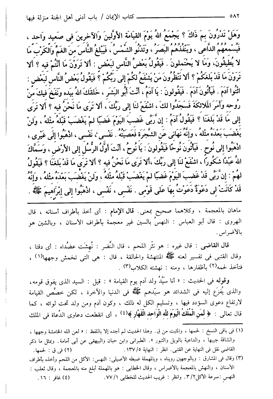 وَهَلْ تَدْرُونَ بِمَ ذَاكَ؟ يَجْمَعُ اللهُ يَوْمَ القِيَامَةِ الأَوَّلِينَ وَالآخِرِينَ فِى صَعِيدٍ وَاحِدٍ، فَيُسْمِعُهُمُ الدَّاعِى، وَيَنْفُذُهُمُ البَصَرُ، وَتَدْنُو الشَّمْسُ، فَيَبْلغُ النَّاسَ مِنَ الغَمِّ وَالكَرْبِ مَا لا يُطِيقُونَ، وَمَا لا يَحْتَمِلونَ. فَيَقُولُ بَعْضُ النَّاسِ لِبَعْضٍ: أَلا تَرَوْنَ مَا أَنْتُمْ فِيهِ؟ أَلا تَرَوْنَ مَا قَدْ بَلغَكُمْ؟ أَلا تَنْظُرُونَ مَنْ يَشْفَعُ لكُمْ إِلى رَبَّكُمْ؟ فَيَقُولُ بَعْضُ النَّاسِ لِبَعْضٍ: ائْتُوا آدَمَ. فَيَأتُونَ آدَمَ. فَيَقُولونَ: يَا آدَمُ، أَنْتَ أَبُو البَشَرِ، خَلقَكَ اللهُ بِيَدِهِ وَنَفَخَ فِيكَ مِنْ رُوحِهِ وَأَمَرَ المَلائِكَةَ فَسَجَدُوا لكَ، اشْفَعْ لنَا إِلى رَبِّكَ، أَلا تَرَى مَا نَحْنُ فِيهِ؟ أَلا تَرَى إِلى مَا قَدْ بَلغَنَا؟ فَيَقُولُ آدَمُ: إِنَّ رَبِّى غَضِبَ اليَوْمَ غَضَبًا لمْ يَغْضَبْ قَبْلَهُ مِثْلهُ، وَلنْ يغْضَبَ بَعْدَهُ مِثْلهُ، وَإِنَّهُ نَهَانِى عَنِ الشَّجَرَةِ فَعَصَيْتُهُ. نَفْسِى، نَفْسِى، اذْهَبُوا إِلَى غَيْرِى، اذْهَبُوا إِلى نُوحٍ. فَيَأتُونَ نُوحًا فَيَقُولونَ: يَا نُوحُ، أَنْتَ أَوَّلُ الرُّسُلِ إِلى الأَرْضِ، وَسَمَّاكَ اللهُ عَبْدًا شَكُورًا، اشْفَعْ لنَا إِلى رَبِّكَ، أَلا تَرَى مَا نَحْنُ فِيهِ؟ أَلا تَرَى مَا قَدْ بَلغَنَا؟ فَيَقُولُ لهُمْ: إِنَّ رَبِّى قَدْ غَضِبَ اليَوْمَ غَضَبًا لمْ يَغْضَبْ قَبْلهُ مِثْلَهُ، وَلنْ يَغْضَبَ بَعْدَهُ مِثْلهُ، وَإِنَّهُ قَدْ كَانَتْ لِى دَعْوَةٌ دَعَوْتُ بِهَا عَلى قَوْمِى. نَفْسِى، نَفْسِى، اذْهَبُوا إِلى إِبْرَاهِيمَ صَلَّى اللهُ عَلَيْهِ وَسَلَّمَ.