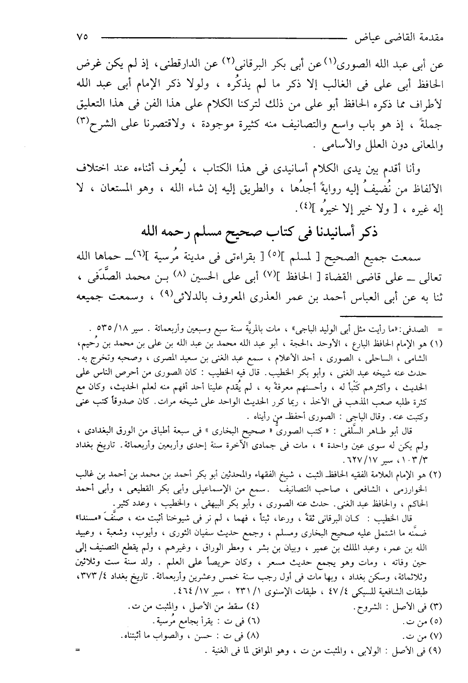 عن أبى عبد الله الصورى (¬1) عن أبى بكر البرقانى (¬2) عن الدارقطنى، إذ لم يكن غرض الحافظ أبى على فى الغالب إلا ذكر ما لم يذكُره، ولولا ذكر الإمام أبى عبد الله لأطراف مما ذكره الحافظ أبو على من ذلك لتركنا الكلام على هذا الفن فى هذا التعليق جملةً، إذ هو باب واسع والتصانيف منه كثيرة موجودة، ولاقتصرنا على الشرح (¬3) والمعانى دون العلل والأسامى.
