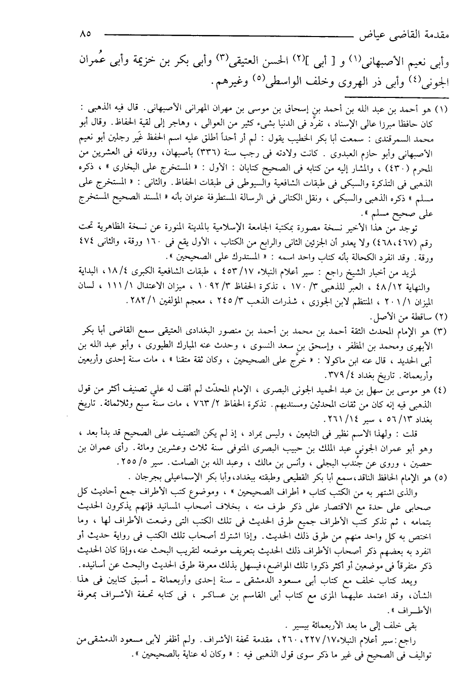 (¬1) هو أحمد بن عبد الله بن أحمد بن إسحاق بن موسى بن مهران المهرانى الأصبهانى. قال فيه الذهبى: كان حافظاً مبرزاً عالى الإسناد، تفرد فى الدنيا بشىء كثير من العوالى، وهاجر إلى لقية الحفاظ. وقال أبو محمد السمرقندى: سمعت أبا بكر الخطيب يقول: لم أر أحداً أطلق عليه اسم الحفظ غَير رجلين أبو نعيم الأصبهانى وأبو حازم العبدوى. كانت ولادته فى رجب سنة (336) بأصبهان، ووفاته فى العشرين من المحرم (430)، والمشار إليه من كتابه فى الصحيح كتابان: الأول: " المستخرج على البخارى "، ذكره الذهبى فى التذكرة والسبكى فى طبقات الشافعية والسيوطى فى طبقات الحفاظ. والثانى: " المستخرج على مسلم " ذكره الذهبى والسبكى، ونقل الكتانى فى الرسالة المستطرفة عنوان بأنه " المسند الصحيح المستخرج على صحيح مسلم ".