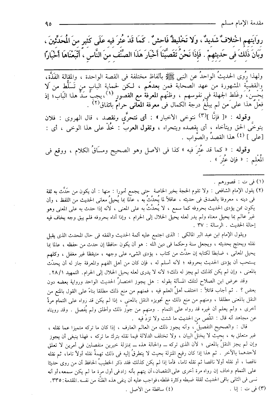(¬2) يقول الإمام الشافعى: ولا تقوم الحجة بخبر الخاصة حتى يجمع أموراً: منها: أن يكون من حَدَّث به ثقة فى دينه، معروفاً بالصدق فى حديثه، عاقلاً لما يُحدِّثُ به، عالماً بما يُحيلُ معانى الحديث من اللفظ، وأن يكون ممن يؤدى الحديث بحروفه كما سمع، لا يُحدِّثُ به على المعنى، لأنه إذا حدث به على المعنى وهو غيرُ عالم بما يحيل معناه ولم يدر لعله يحيل الحلال إلى الحرام، وإذا أداه بحروفه فلم يبق وجه يخاف فيه إحالة الحديث. الرسالة: 37.