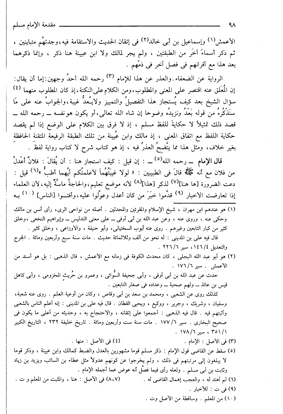 (¬5) سقط عن القاضى قول الإمام: ذكر مسلم قوماً مشهورين بالعدل والضبط كمالك وابن عيينة، وذكر قوماً لا يبلغون إلى مرتبتهم فى ذلك، ولم يخرجوا عن كونهم عدولاً مثل عطاء بن السائب ويزيد بن زياد وثابت بن أبى مسلم. ولعله رأى فيما فصَّل أنه عوض عما أجمله الإمام.