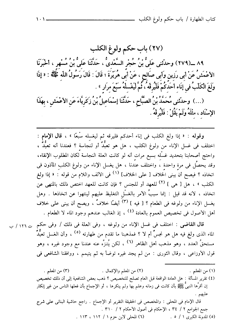 89 - (279) وحدّثنى عَلِىُّ بْنُ حُجْرِ السَّعْدِىُّ، حَدَّثَنَا عَلِىُّ بْنُ مُسْهِرٍ، أَخْبَرَنَا الأَعْمَشُ عَنْ أَبِى رَزِينٍ وَأبِى صَالِحٍ، عَنْ أَبِى هُرَيْرَةَ؛ قَالَ: قَالَ رَسُولُ اللهِ صَلَّى اللهُ عَلَيْهِ وَسَلَّمَ: " إِذَا وَلَغَ الْكَلْبُ فِى إنَاءِ أحَدِكُمْ فَلْيُرِقْهُ، ثُمَّ ليَغْسِلْهُ سَبْعَ مِرَارٍ ".